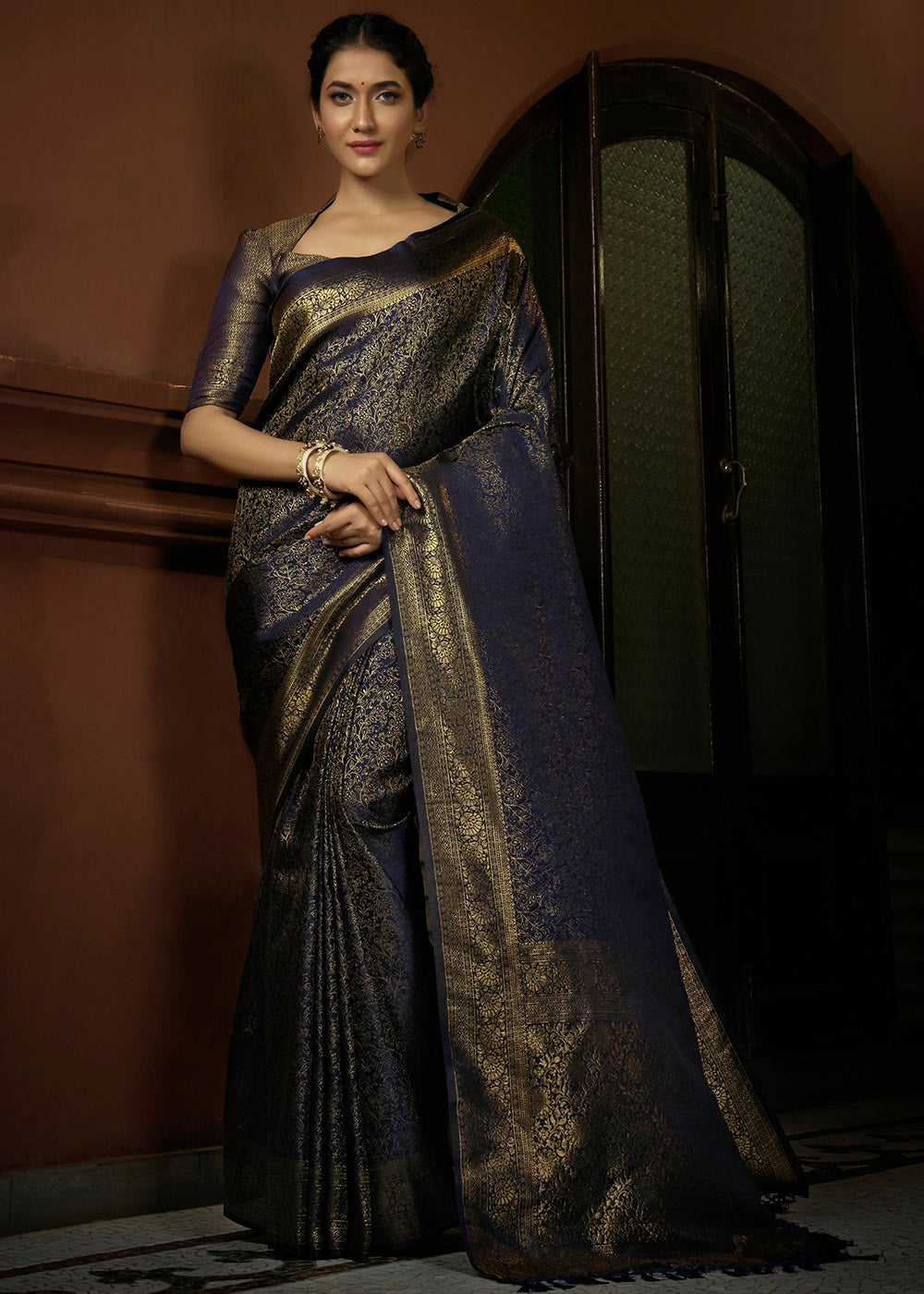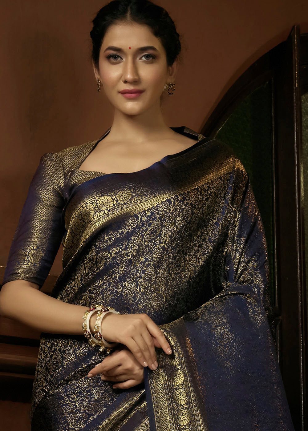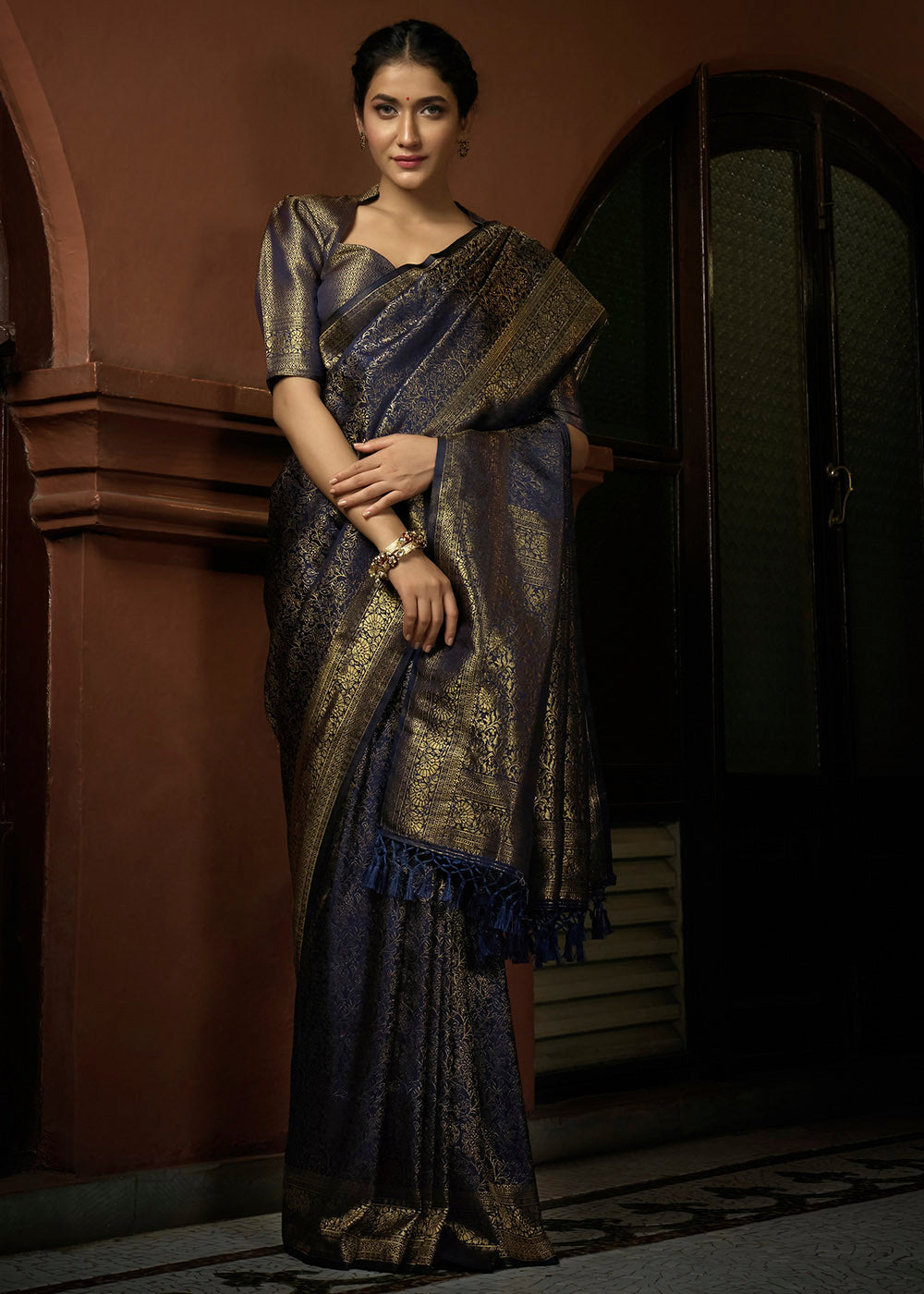 Presidential Blue & Golden Blend Woven Kanjivaram Silk Saree