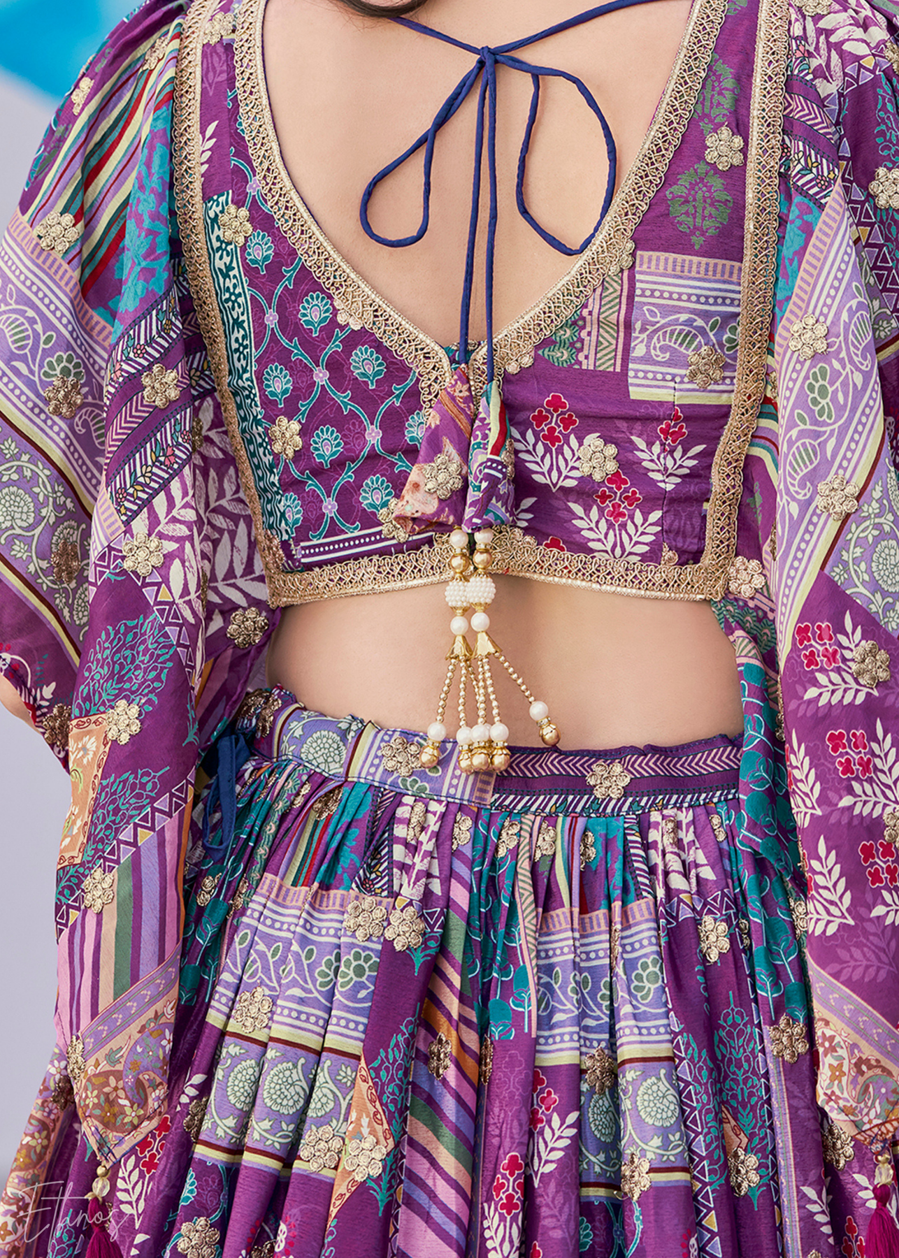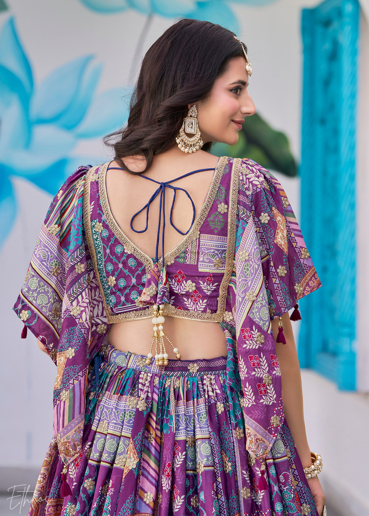 Discover regal charm with sophisticated purple multi-color patchwork lehenga choli, a perfect fusion of rich jewel tones and intricate design. The luxurious chinnon silk fabric drapes elegantly, showcasing vibrant patchwork and detailed embroidery. This stunning ensemble, complete with a stylish blouse, promises unmatched elegance for a memorable appearance at any grand evening celebration.
