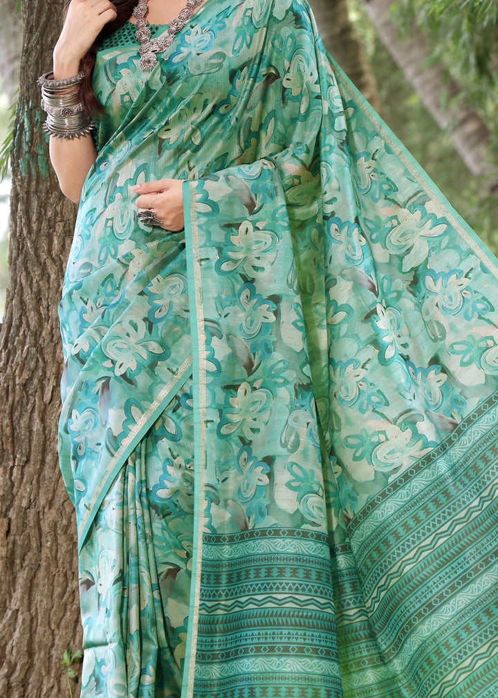 The body of the saree showcases a stunning floral print in harmonious shades, bringing a touch of nature’s beauty to your wardrobe. The vibrant "Rama" green tone enhances its appeal, giving it a fresh and lively look. Complementing the floral patterns, the saree is adorned with a beautifully designed printed pallu, adding an extra dimension of elegance and sophistication.