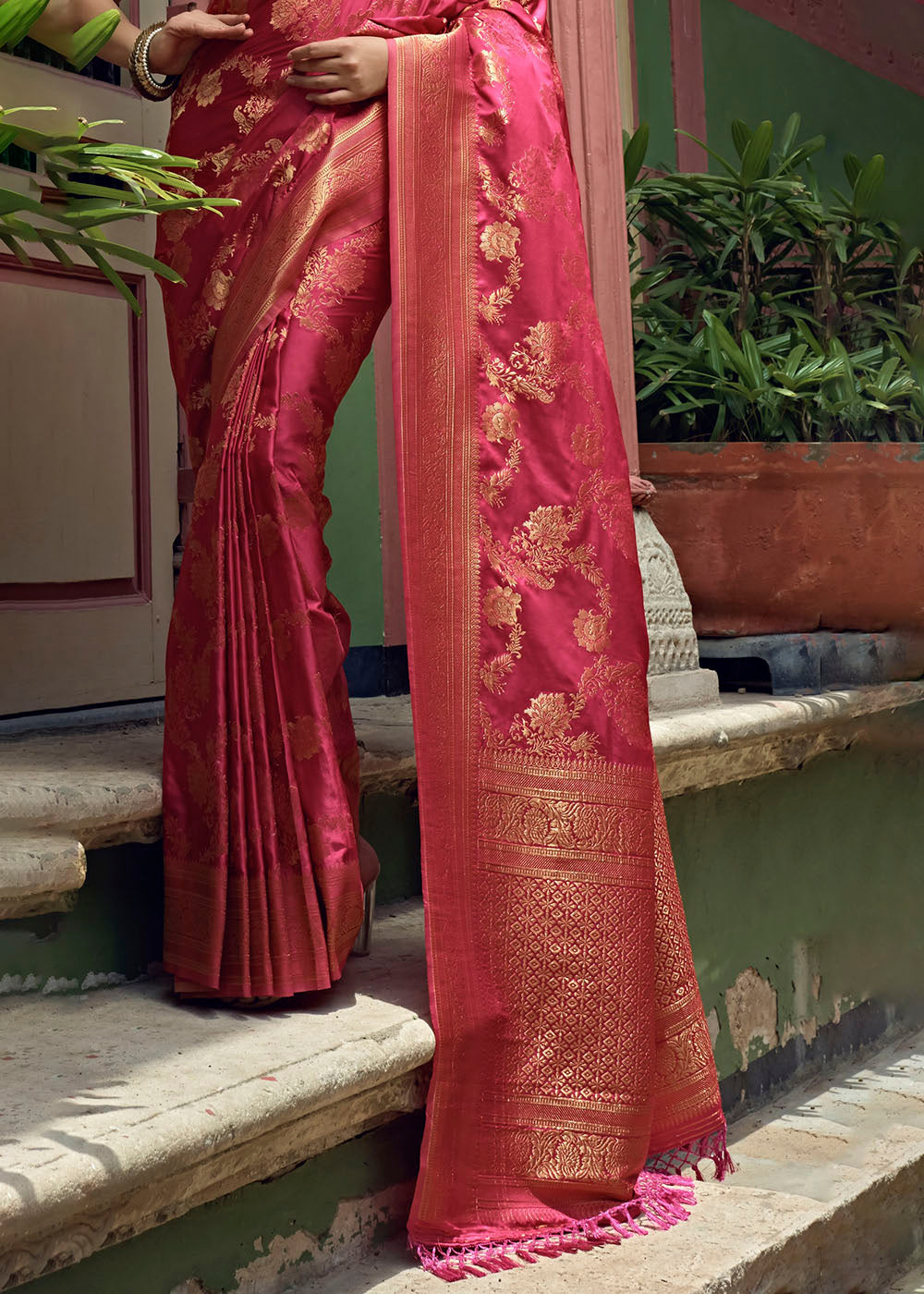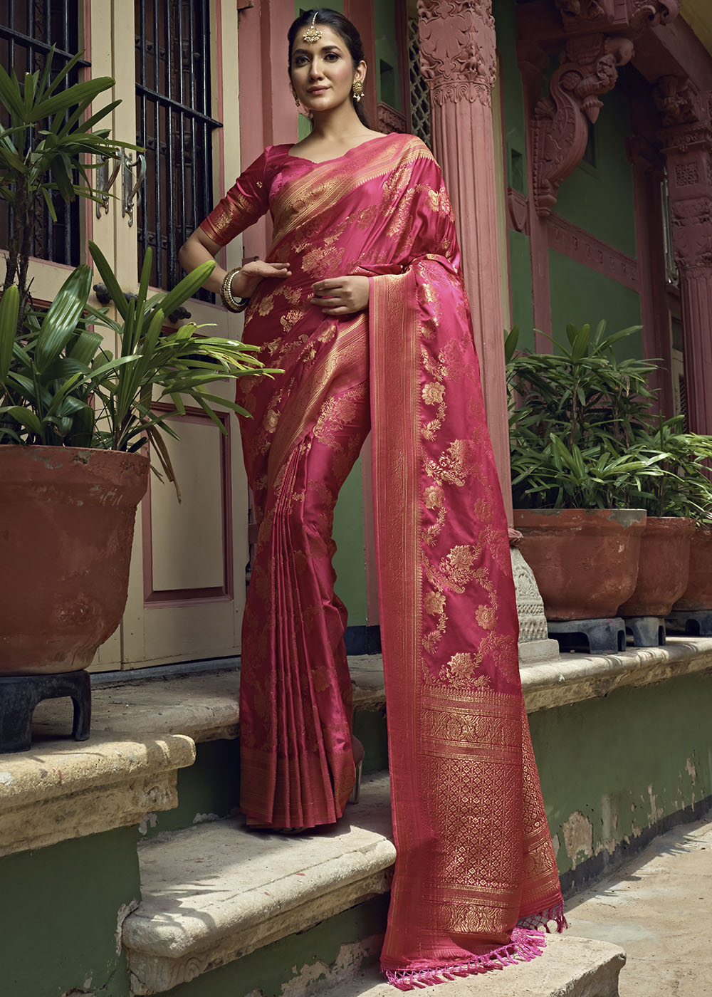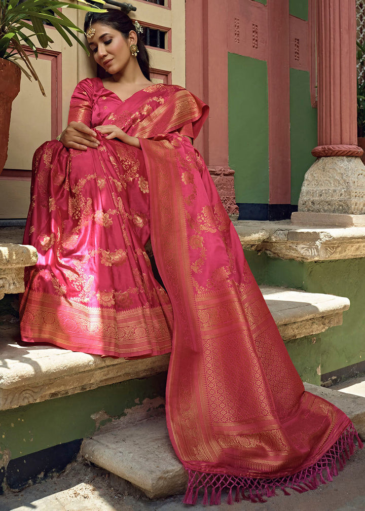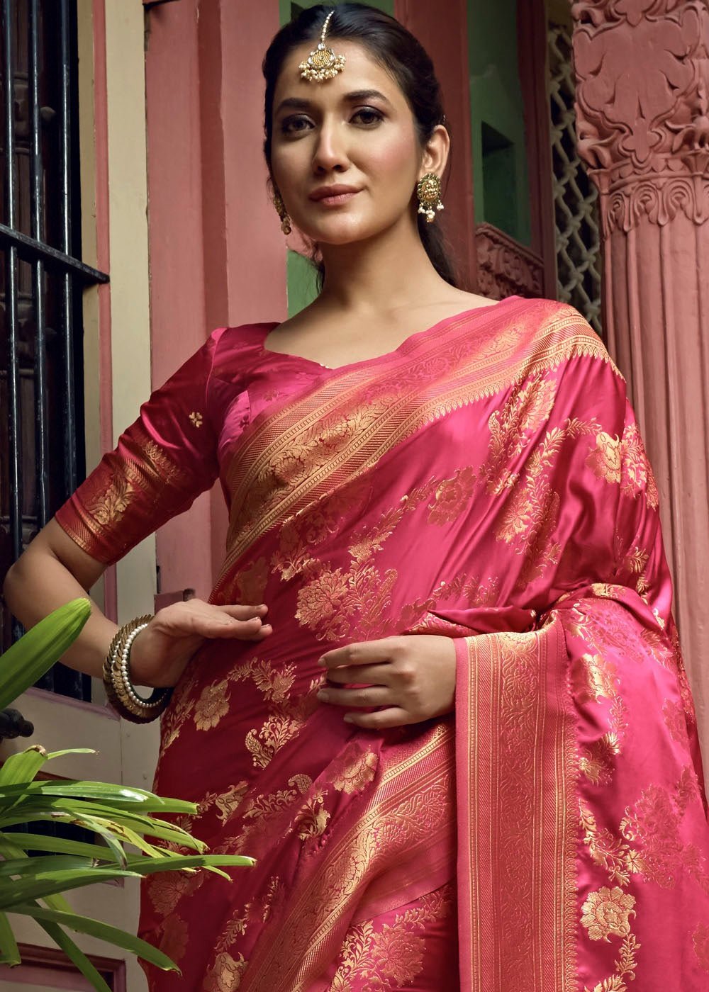 Blending the two most favourite colours, Pink and Golden, here comes this charming Raspberry Pink Woven Designer Satin Silk Saree. Wrapped in the sheen and elegance of Satin, this piece is amazingly luxurious in feel and comes with an alluring Pall design. Drape it with a pair of loop earrings to a cocktail party and be in the spotlight like never before.