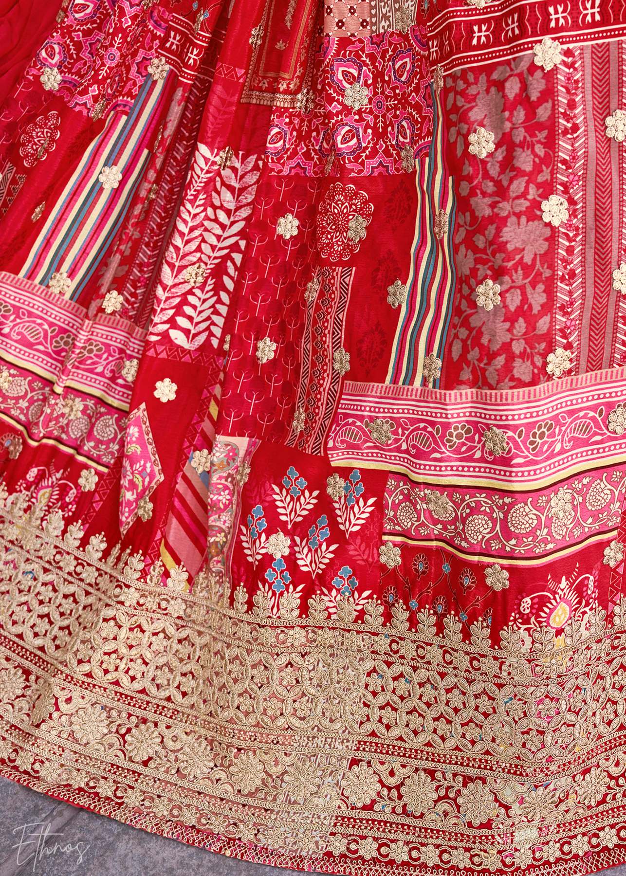 Make a statement in festive red lehenga, perfect for weddings and significant celebrations where you want to stand out. The rich red is enhanced by traditional patchwork in complementary tones and detailed with heavy zari embroidery on a premium chinnon silk fabric. The voluminous flare ensures you are the center of attention at weddings.