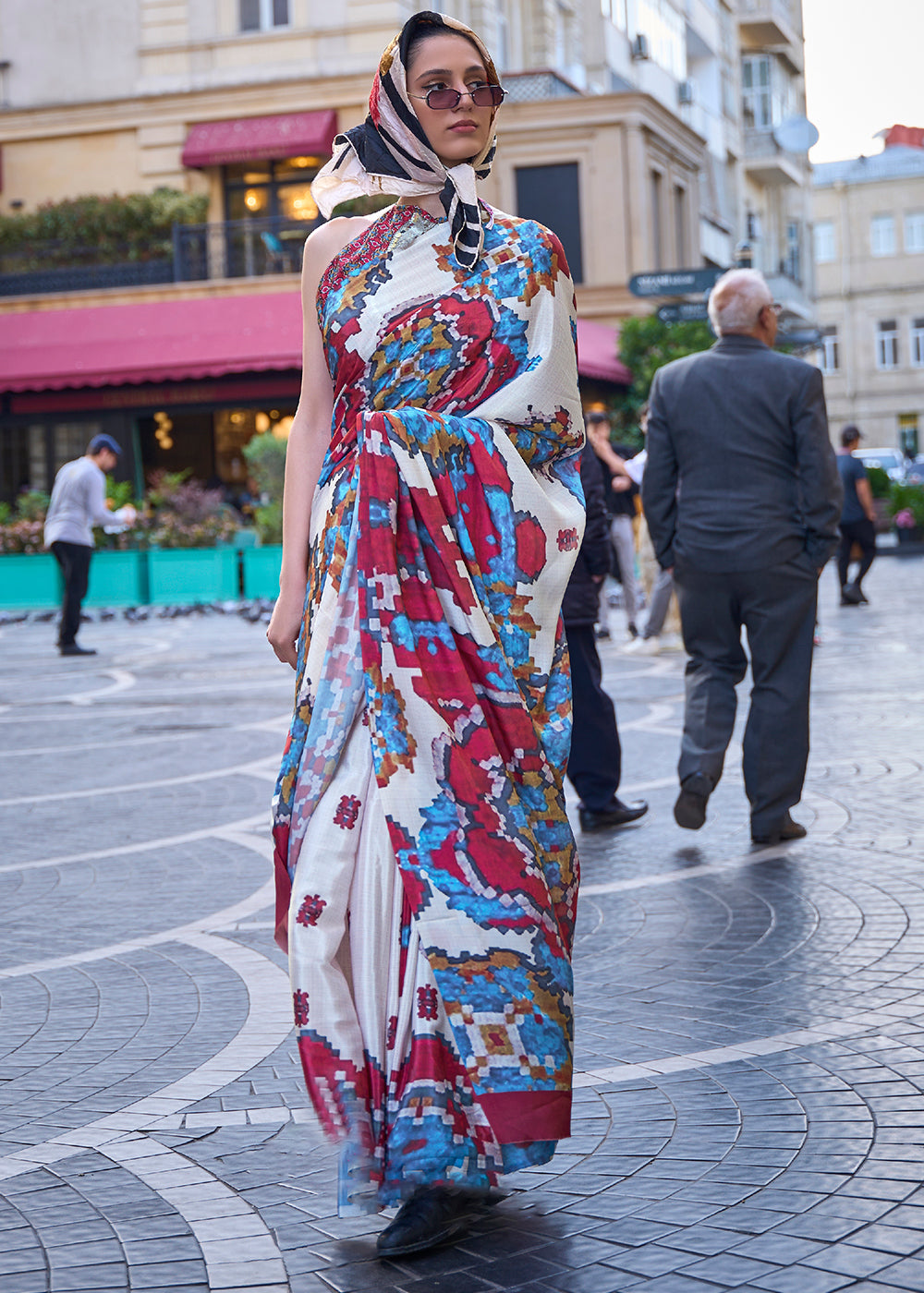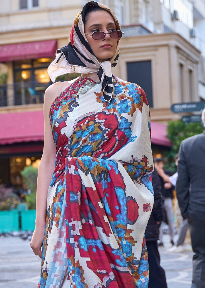 Rice White Digital Printed Crepe Silk Saree