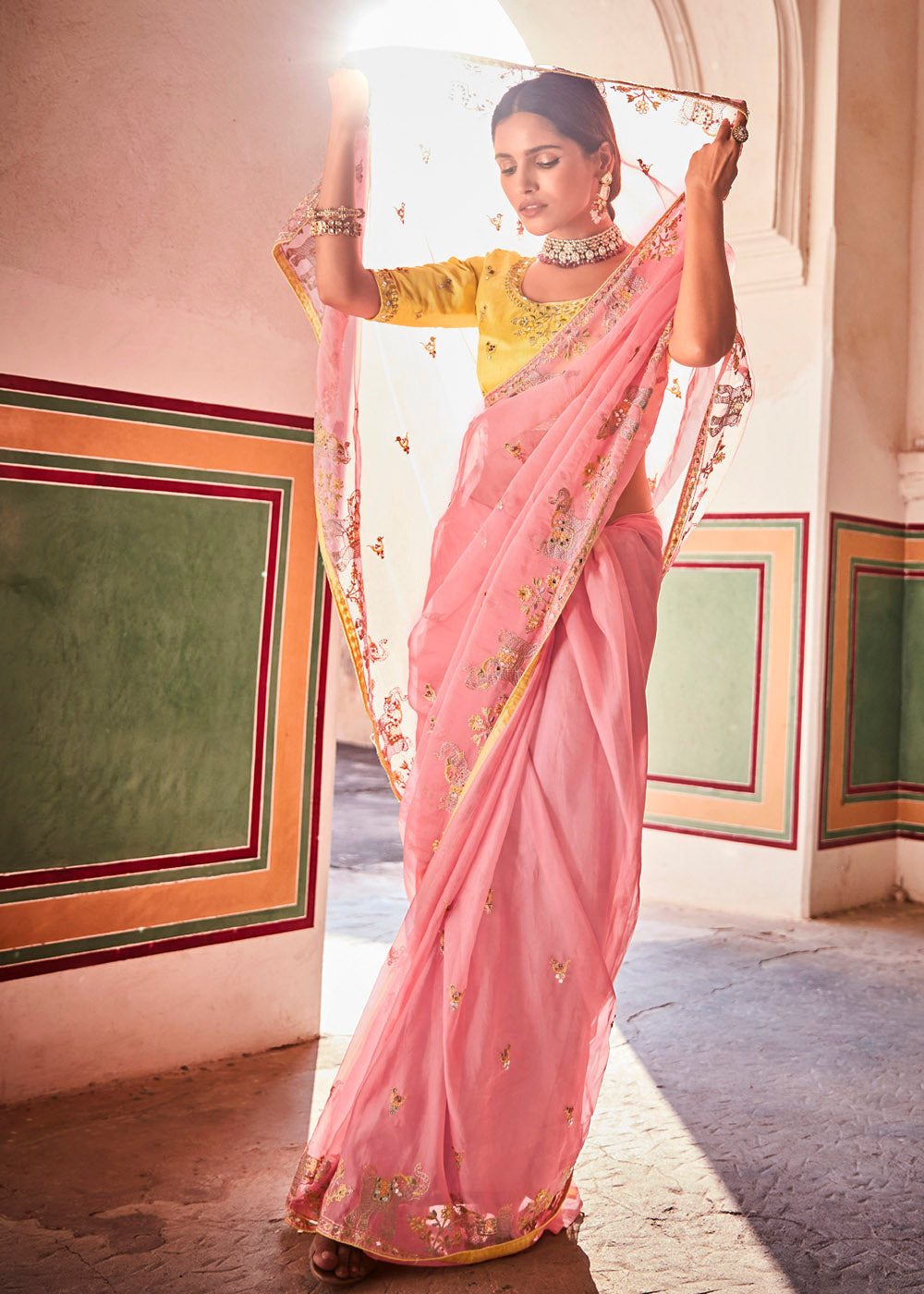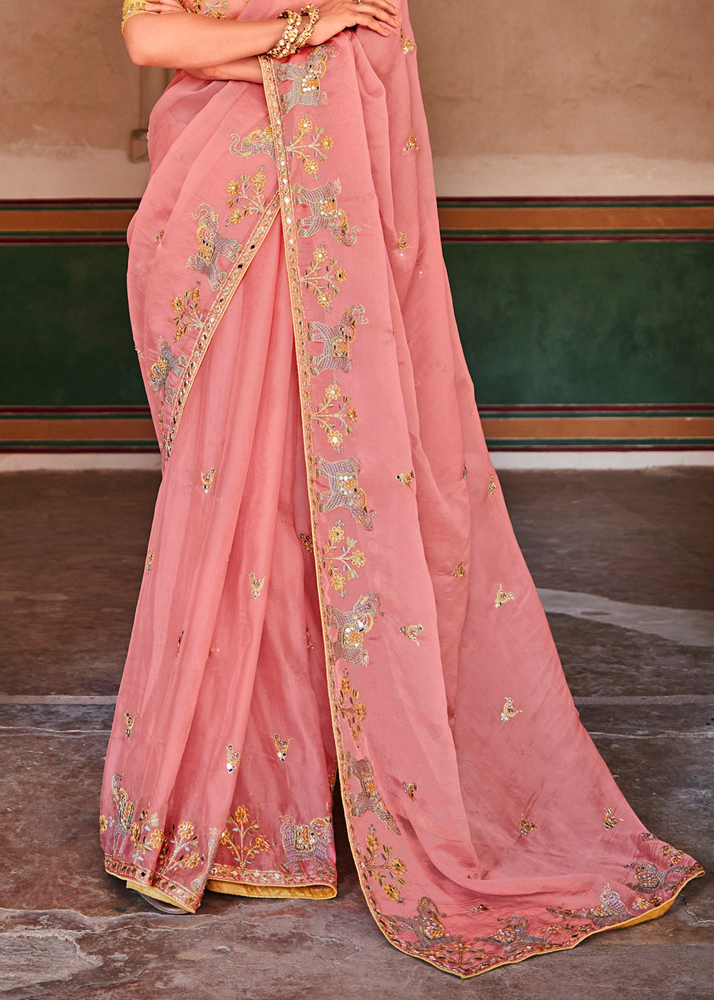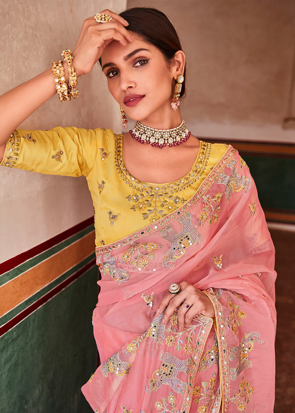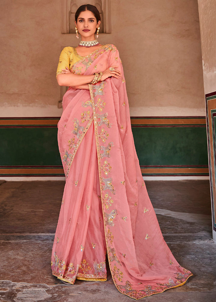 Rose Pink Organza Saree with Zari, Mirror & Thread work