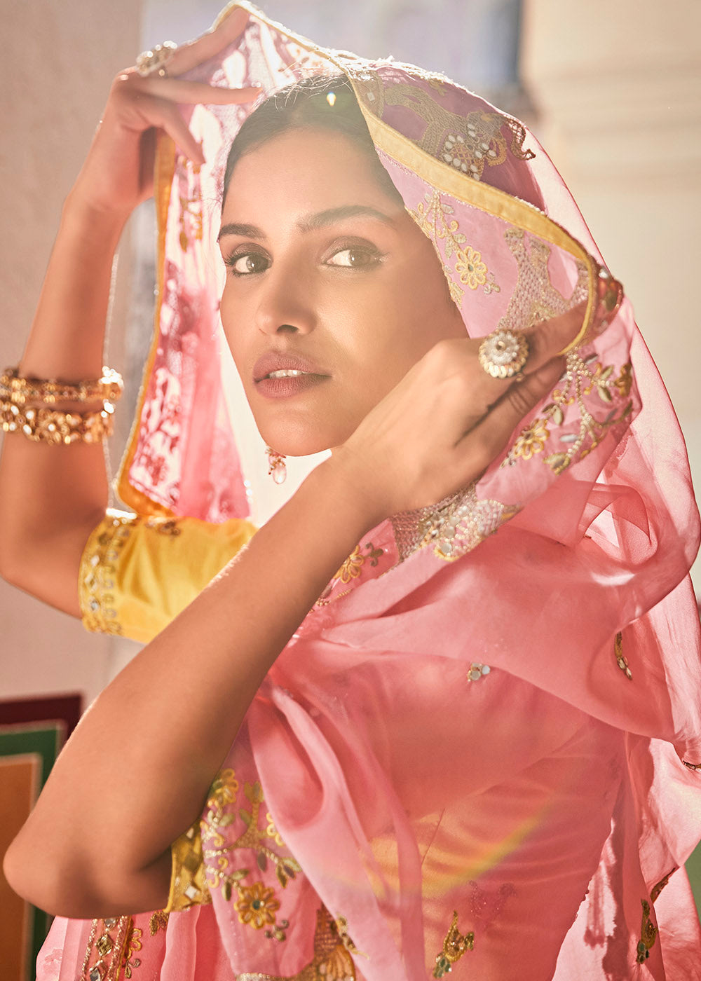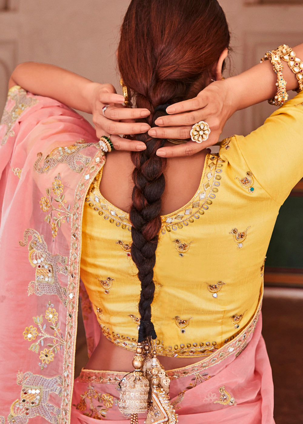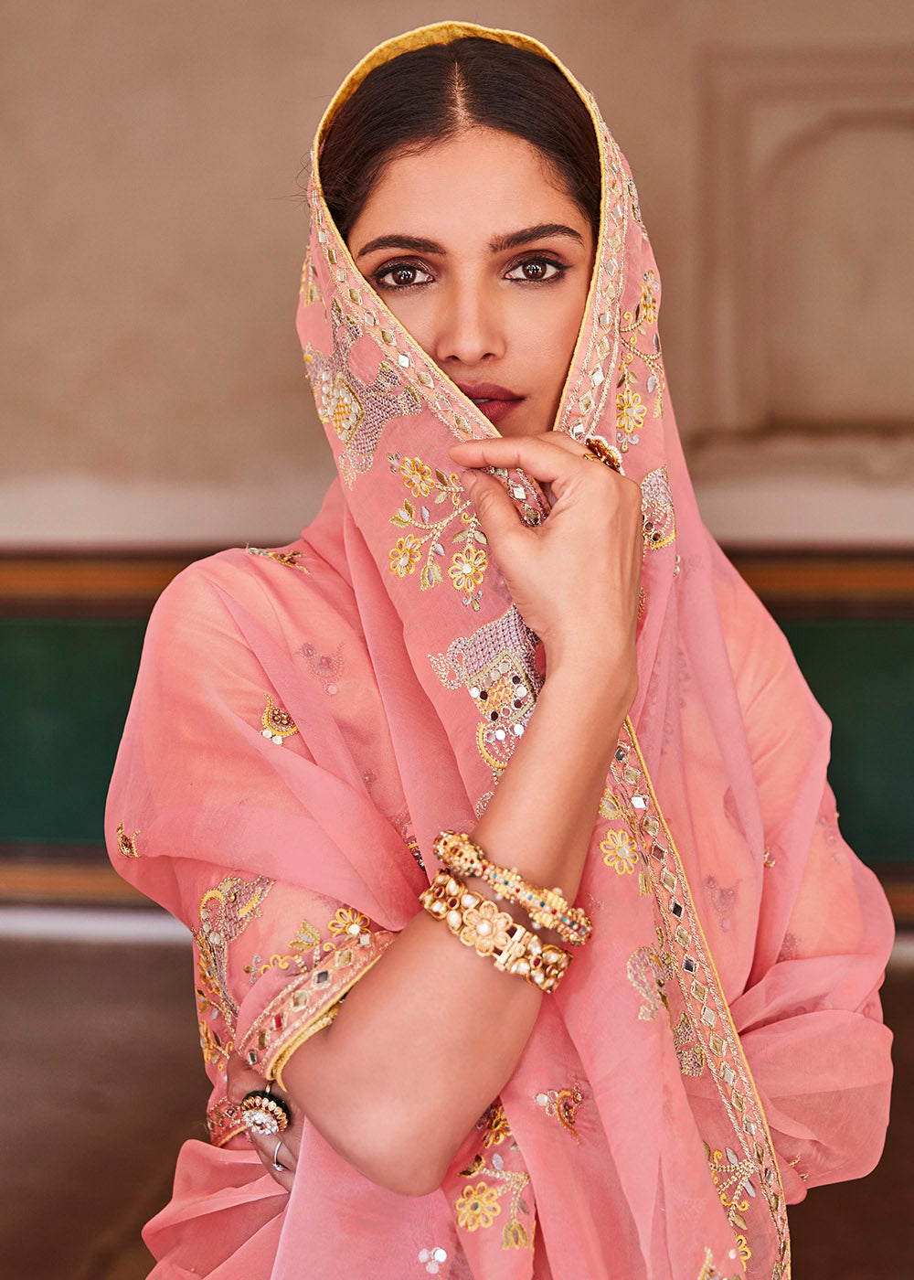 Rose Pink Organza Saree with Zari, Mirror & Thread work