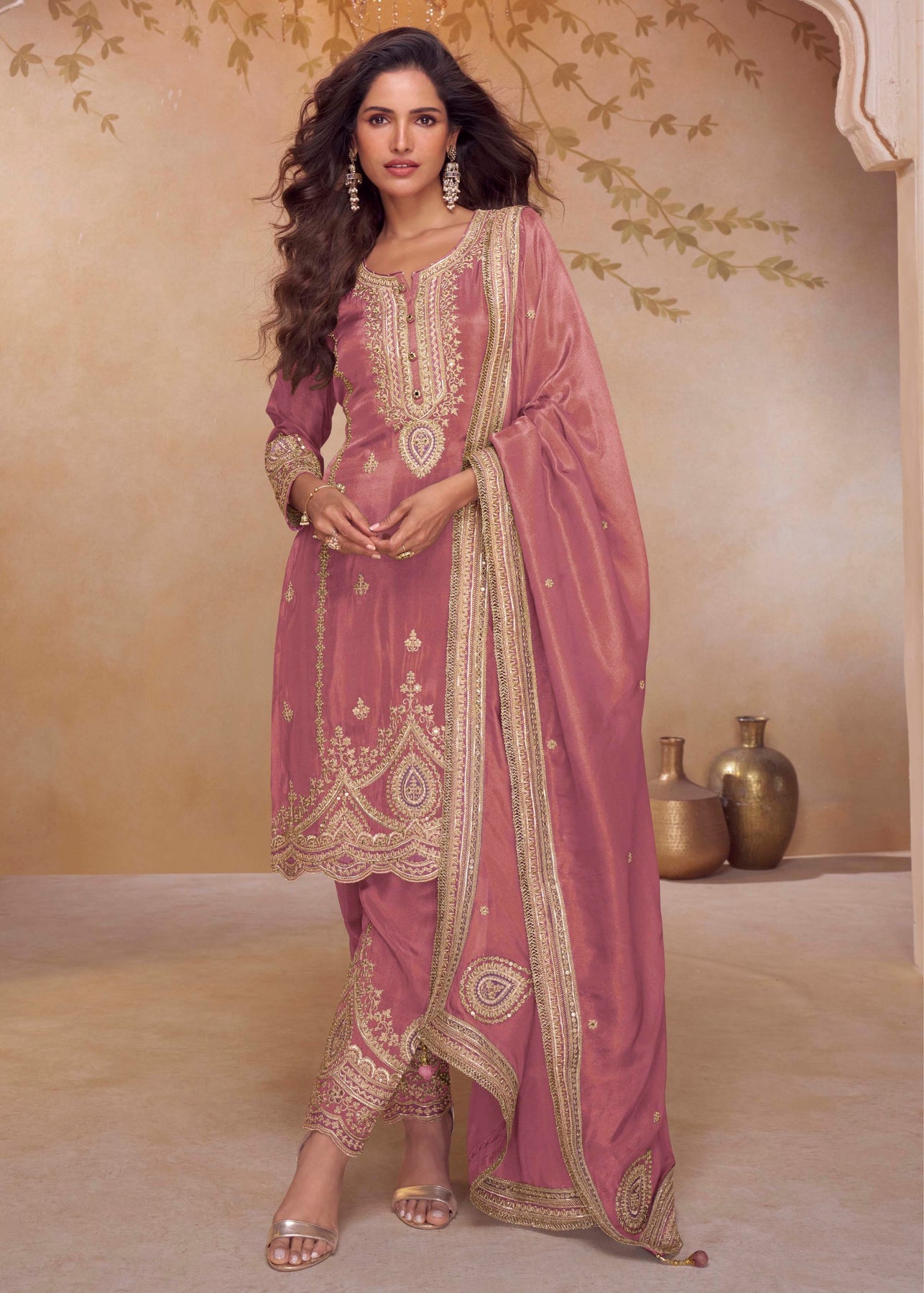 This Rose Pink Silk Salwar Suit is a celebration of softness and sophistication. While the base hue is a romantic rose-pink tone, the real magic lies in how the fabric catches light and shifts mood — under warm light it glows gently, in daylight it holds a serene pastel calmness. The use of pure silk all through (for the top, the bottom, and the dupatta) gives uniform richness and ensures that each part of the ensemble complements the rest seamlessly.