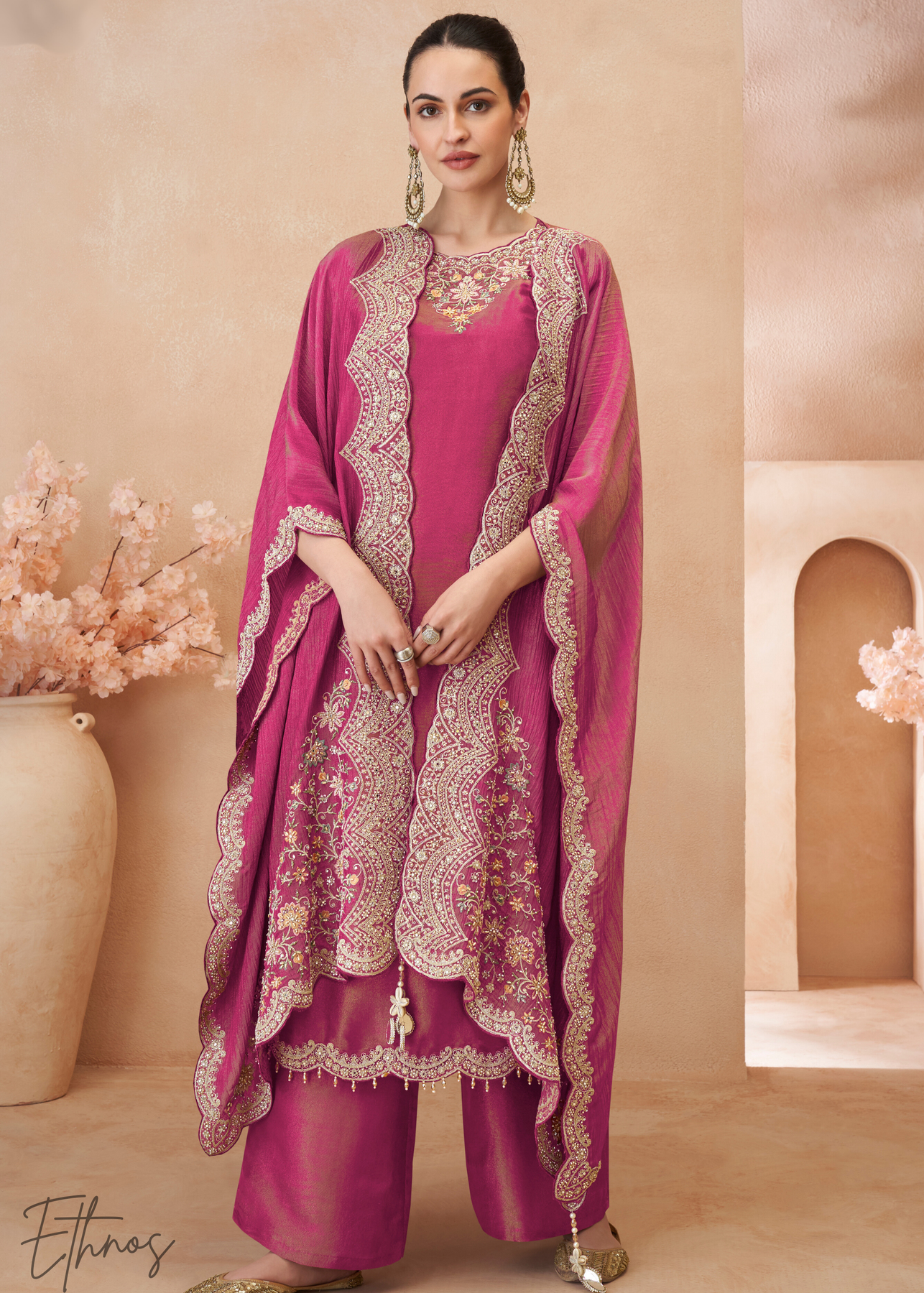 Embrace relaxed elegance in this rose pink simar silk kaftaan palazzo suit, designed for effortless style and comfort. The soft, lustrous silk features a graceful kaftaan silhouette with delicate floral motifs and intricate thread work, flowing into wide, elegant palazzo pants. This ensemble is an ideal choice for festive gatherings, summer parties, and joyful daytime celebrations.