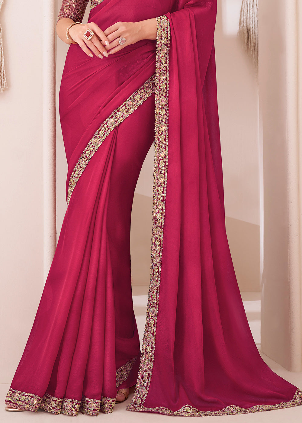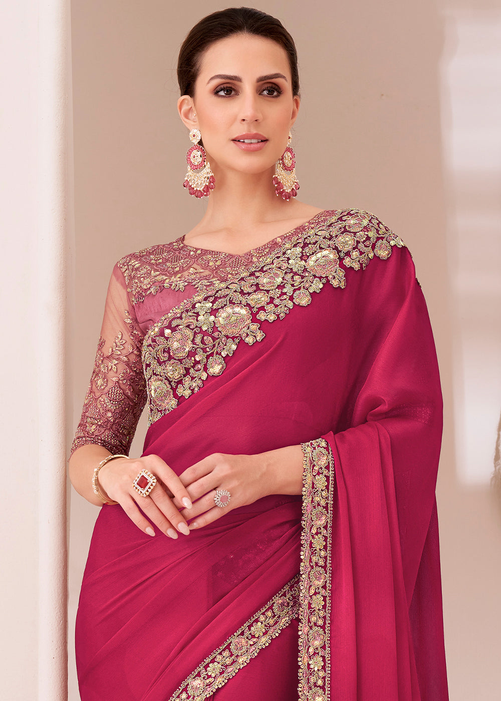 Ruby Pink Designer Embroidered Satin Chiffon Saree