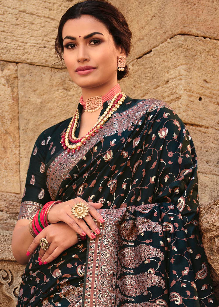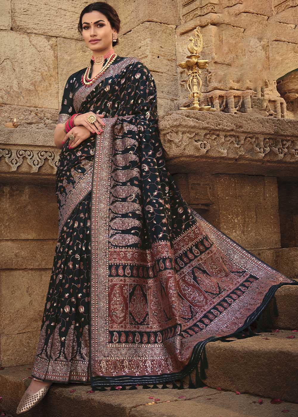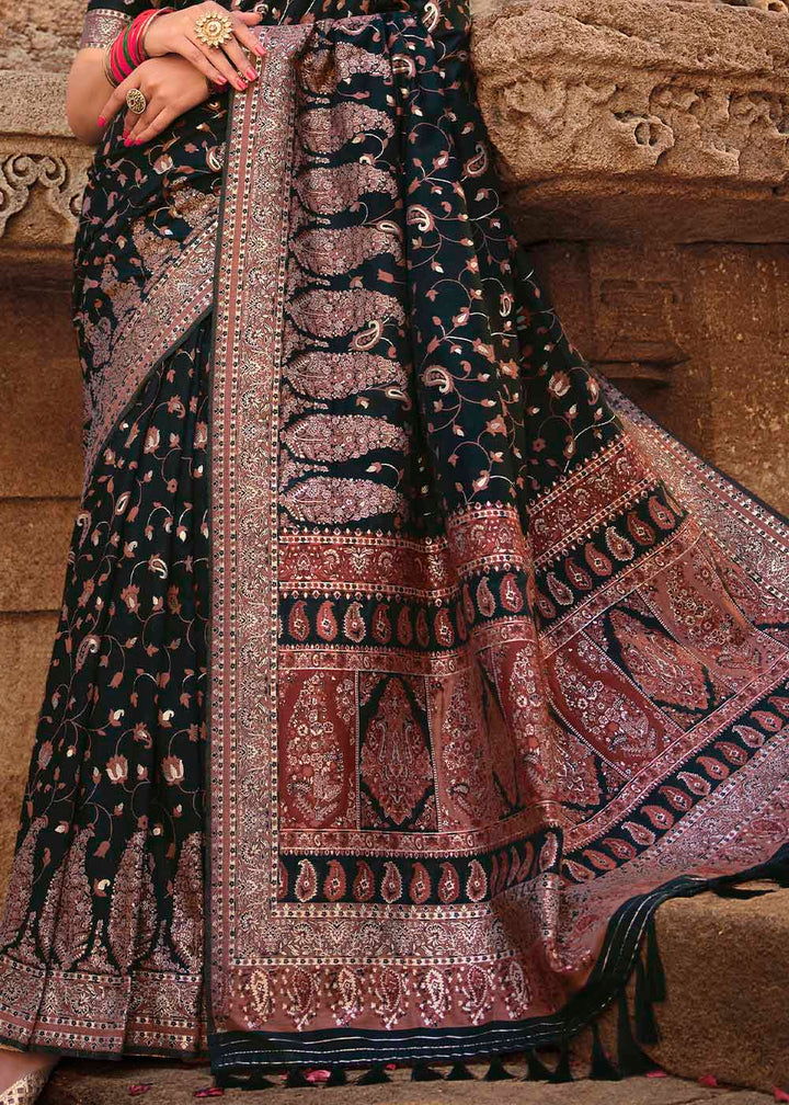 Sable Black Banarasi Kora Silk Saree with Pashmina Weaving & Zari Border Pallu
