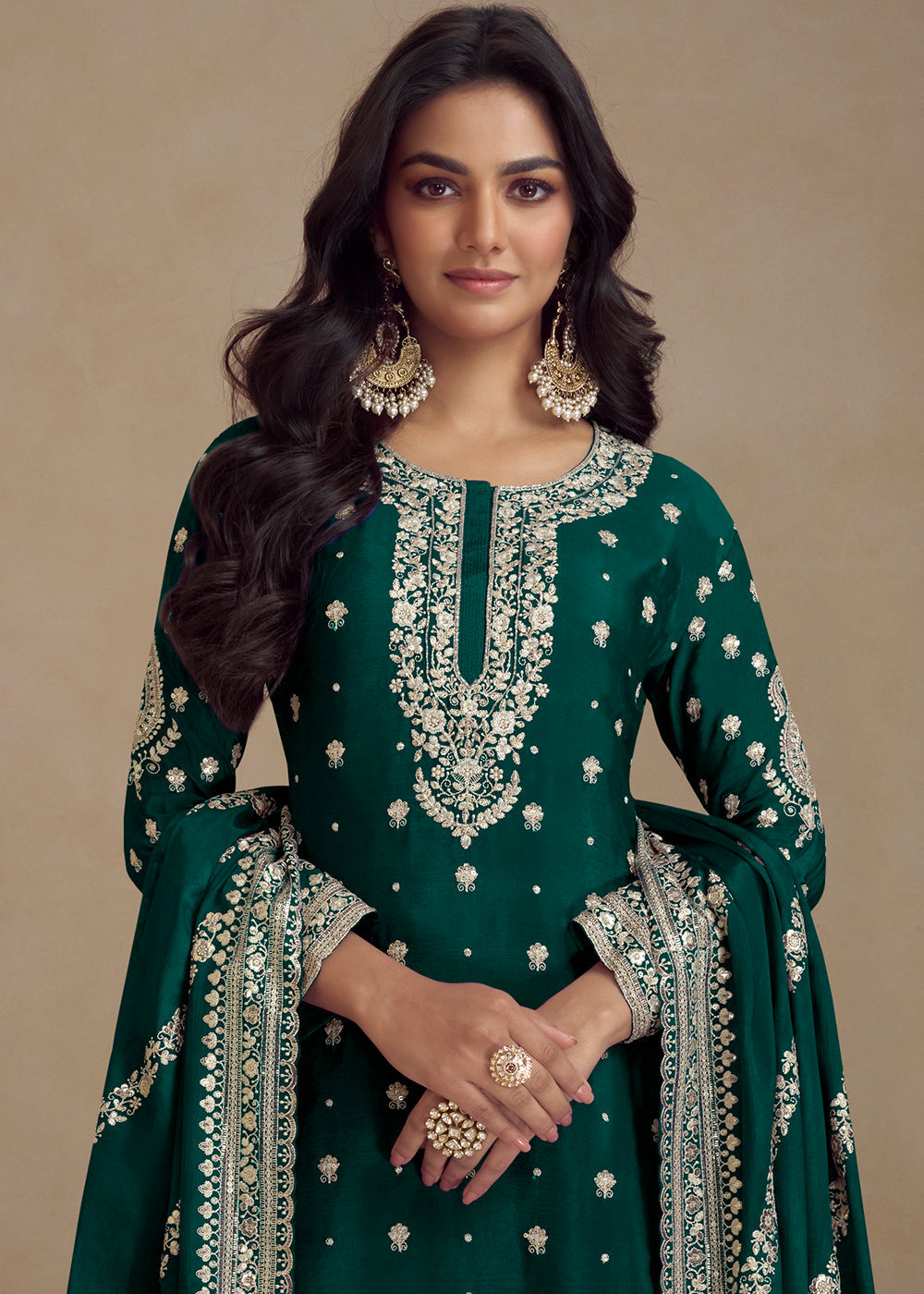 Sacramento Green Embroidered Chinon Silk Plazzo Suit