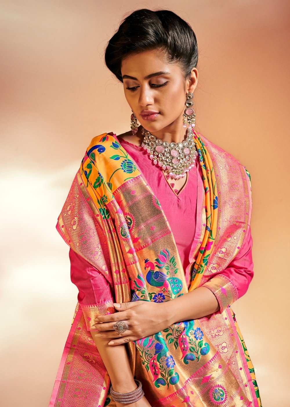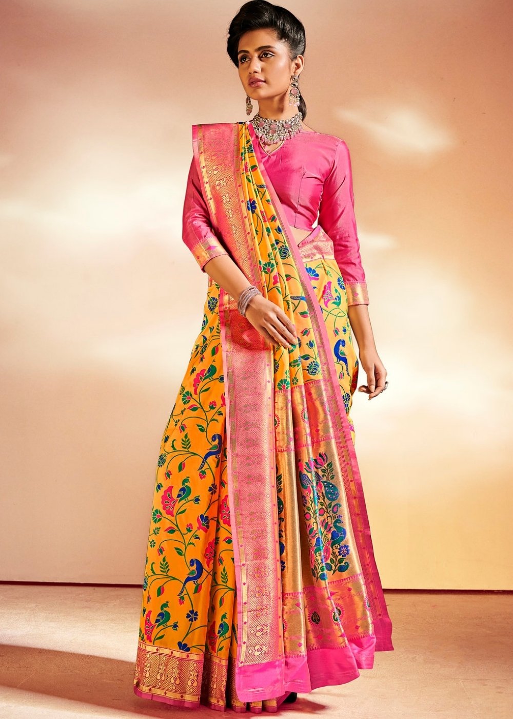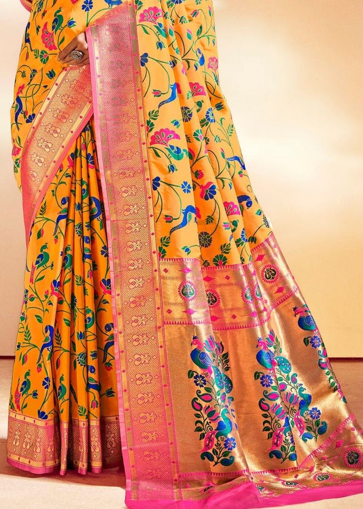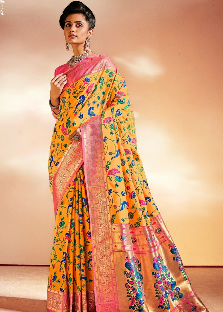 Saffron Yellow Woven Banarasi Paithani Silk Saree
