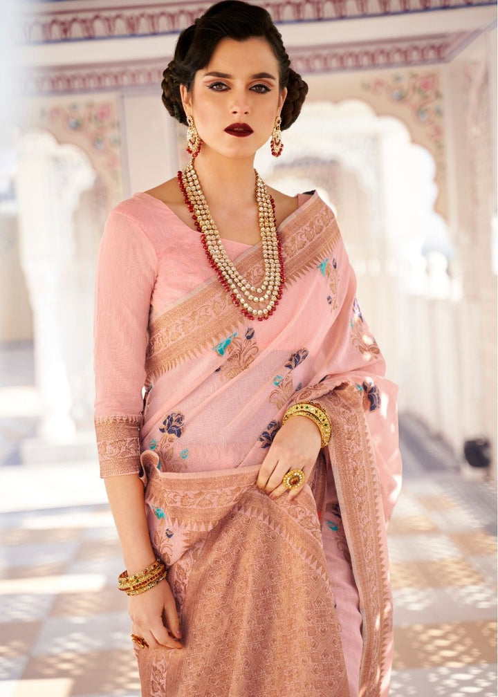 Salmon Pink Linen Woven Silk Saree with Zari work on Border and Pallu