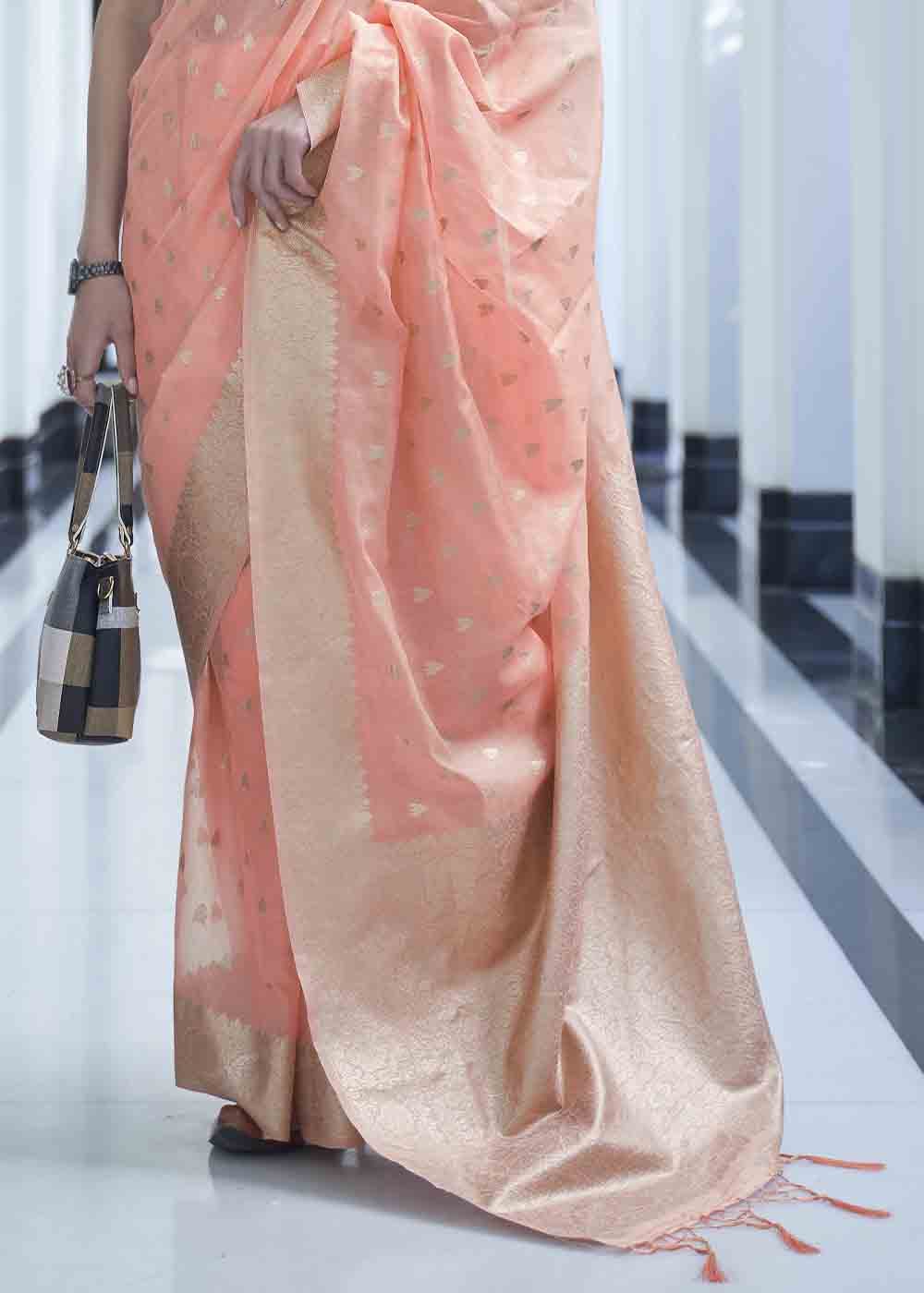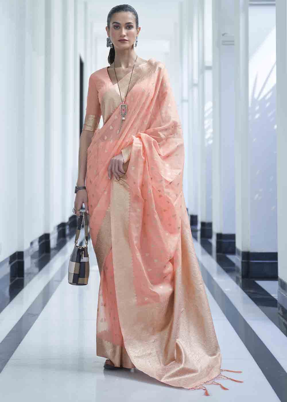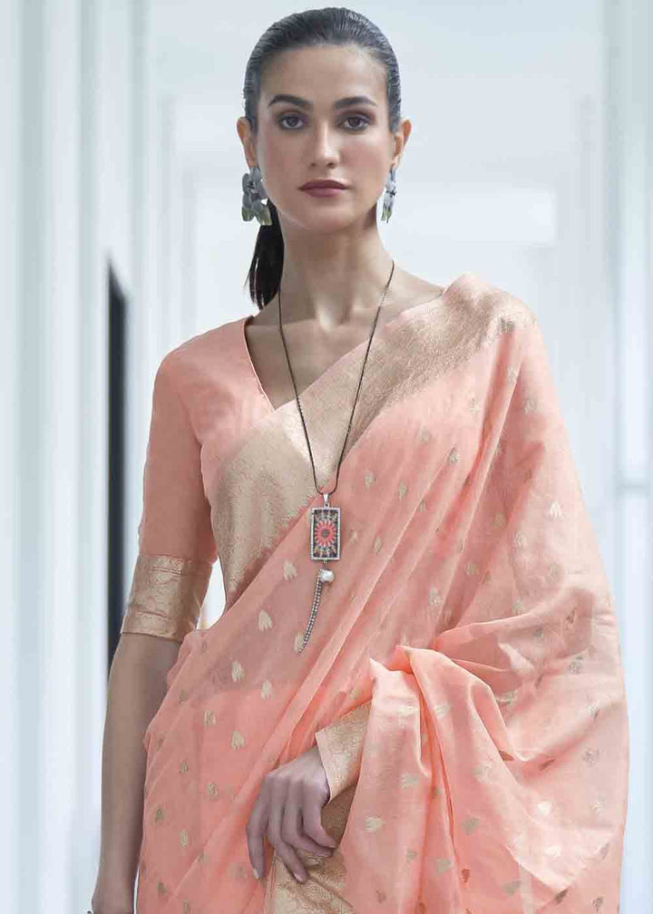 A perfect work soiree for your workwear wardrobe, this Salmon Pink Woven Designer Silk Saree is versatile enough to be your new favourite. Crafted with sophisticated elegance and graceful silken appeal, this is a perfect pick to flaunt your sartorial quotient. Revamp your look with this exotic glam and stay trendy.
