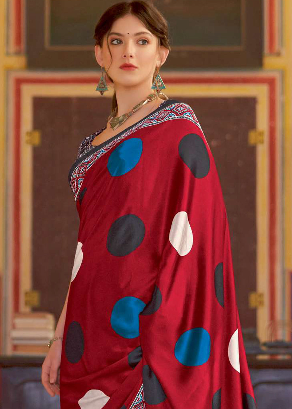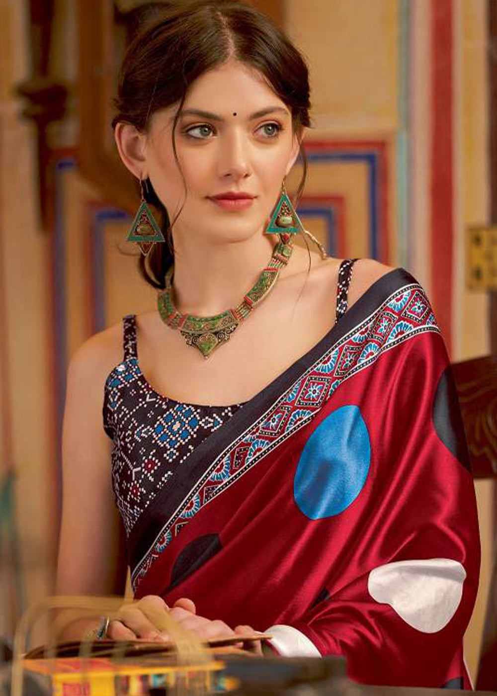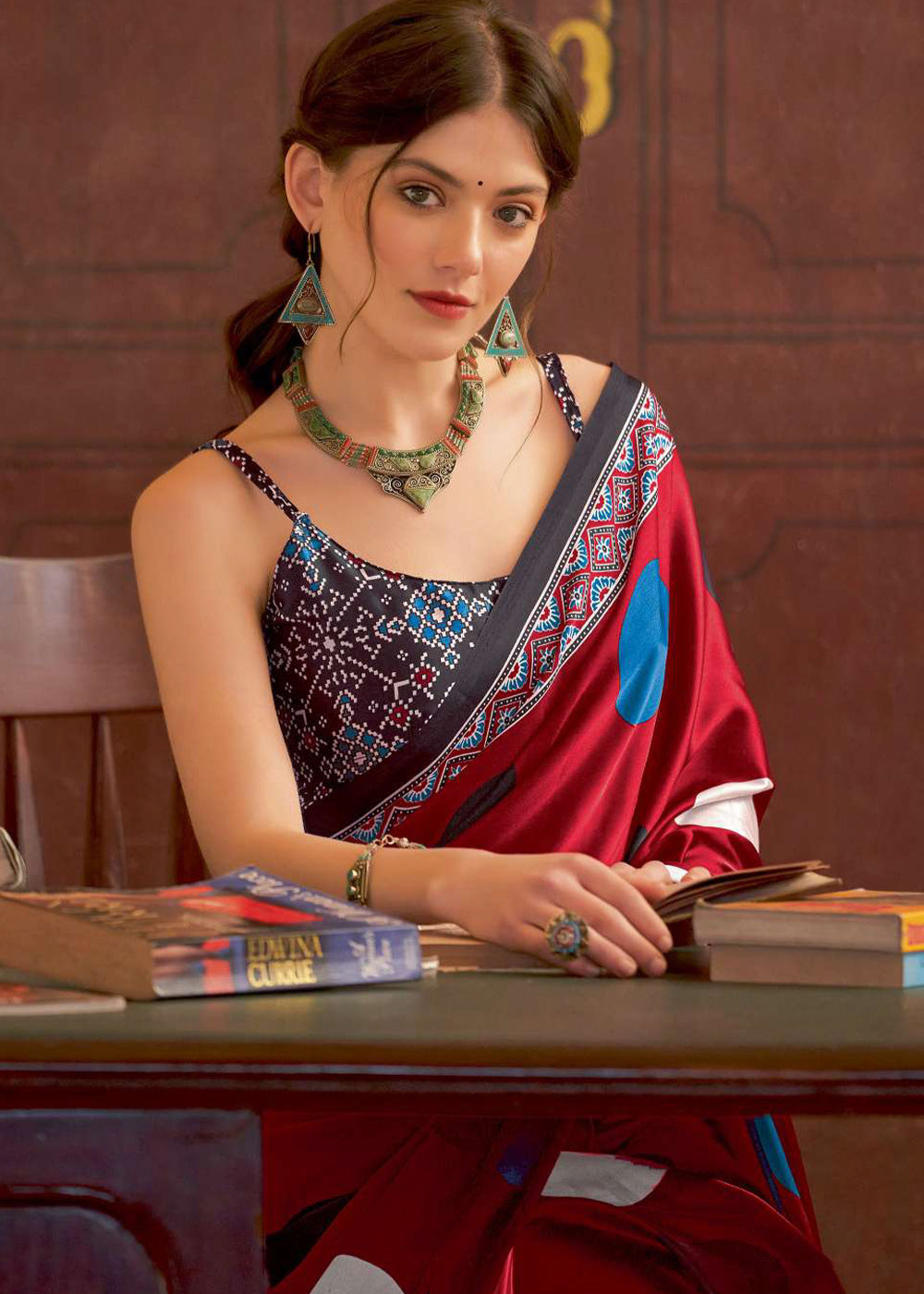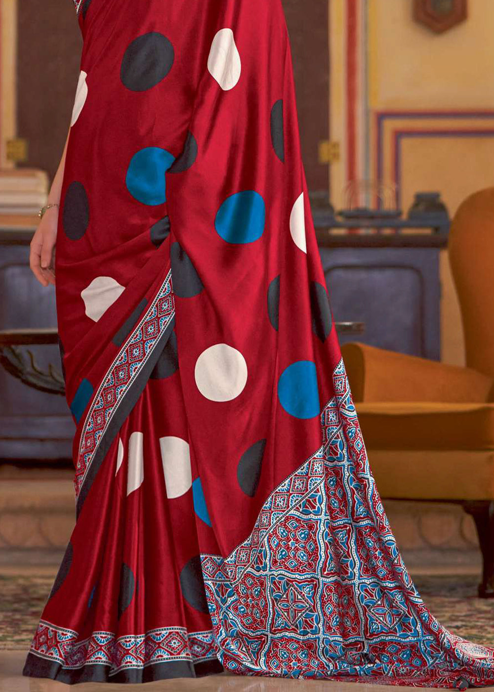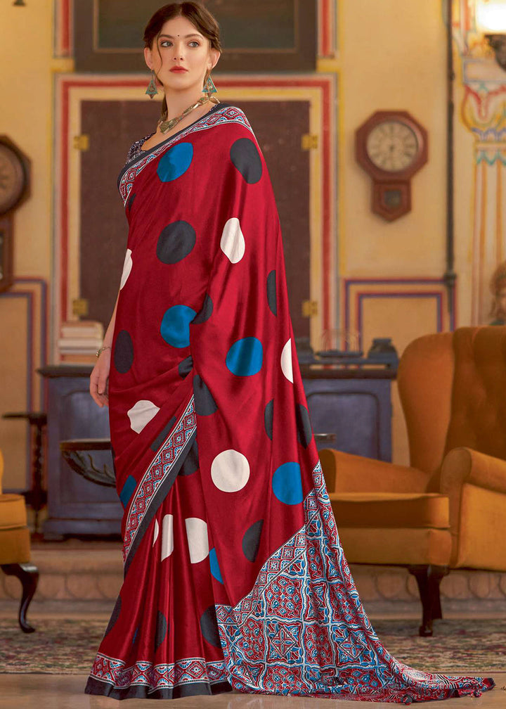Scarlet Red Ajrakh Printed Satin Crepe Saree:Summer Collection