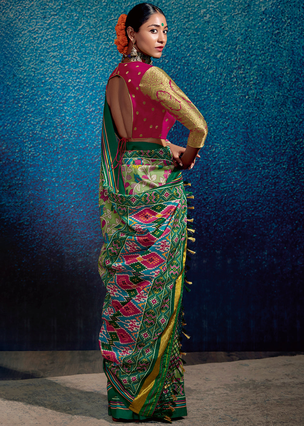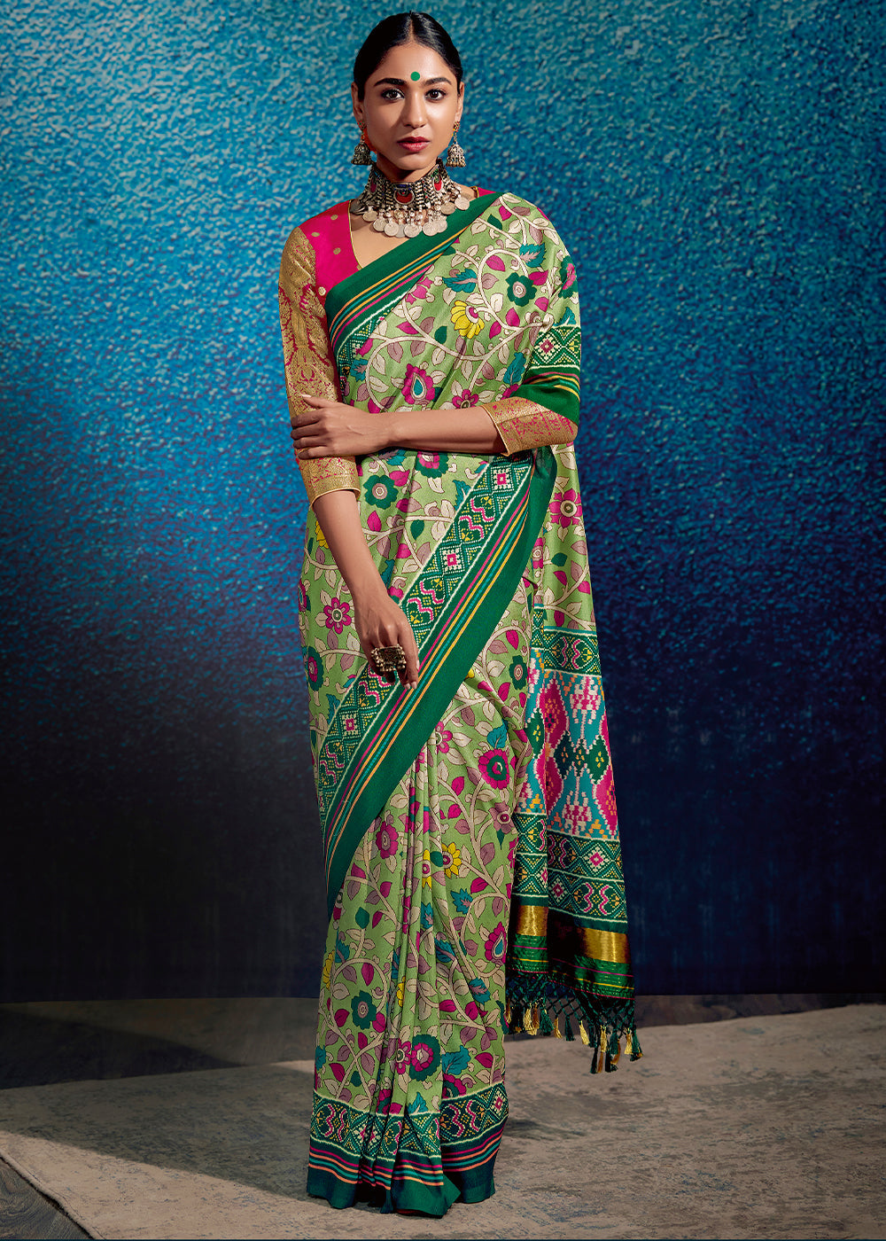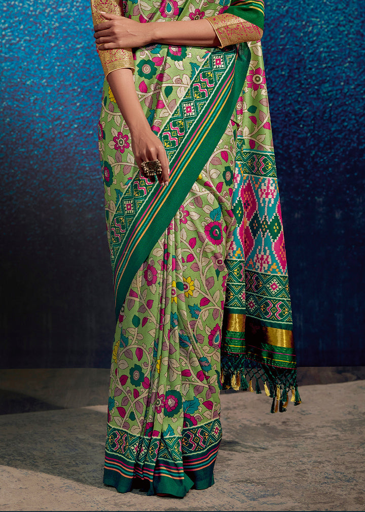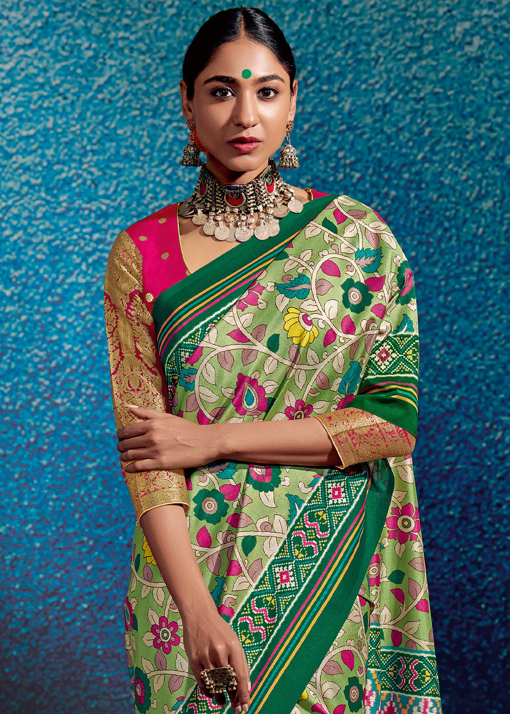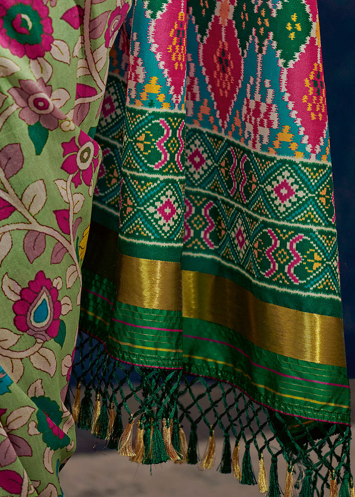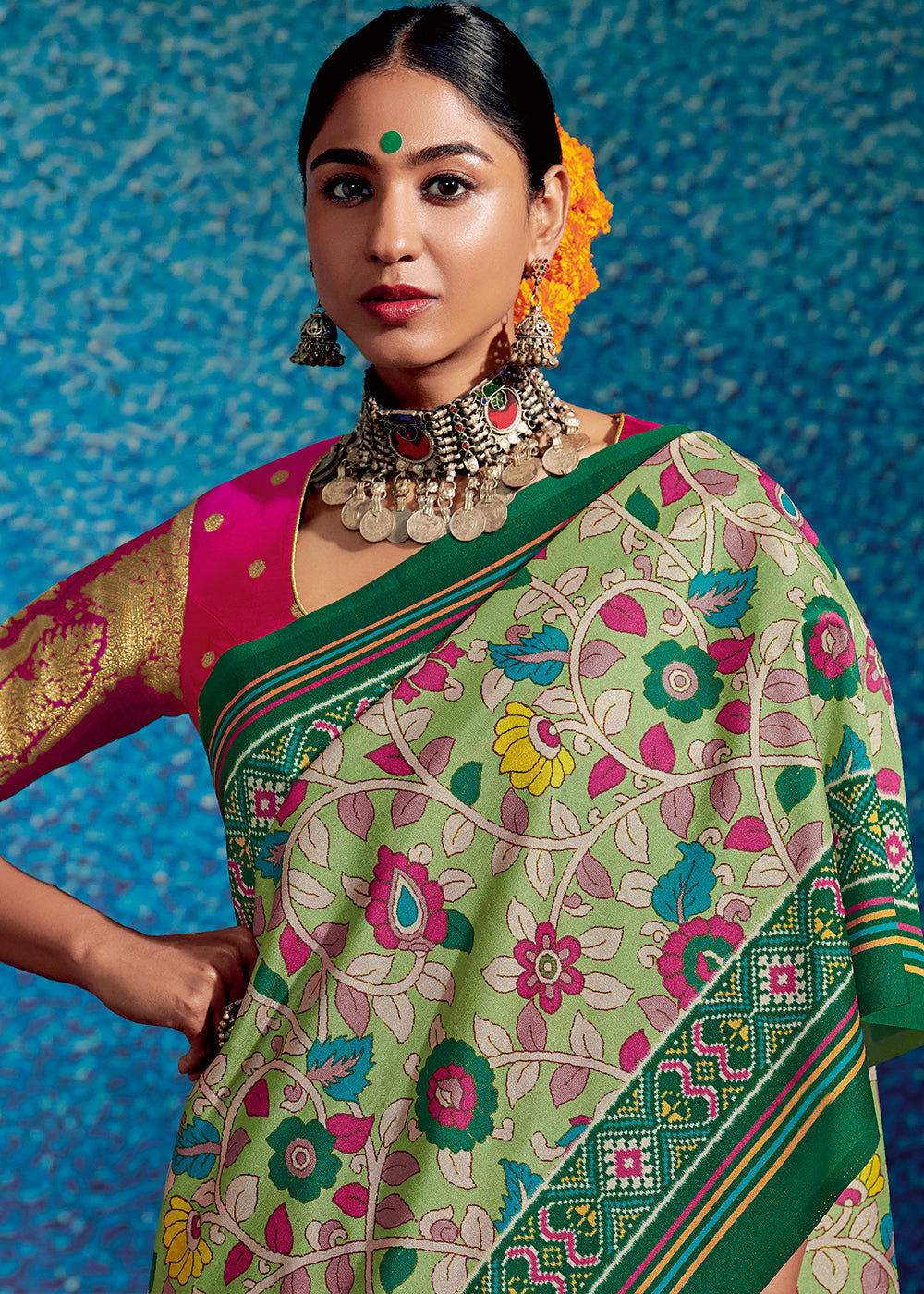 Shades Of Green Kalamkari Printed Soft Tussar Silk Saree with Patola Pallu