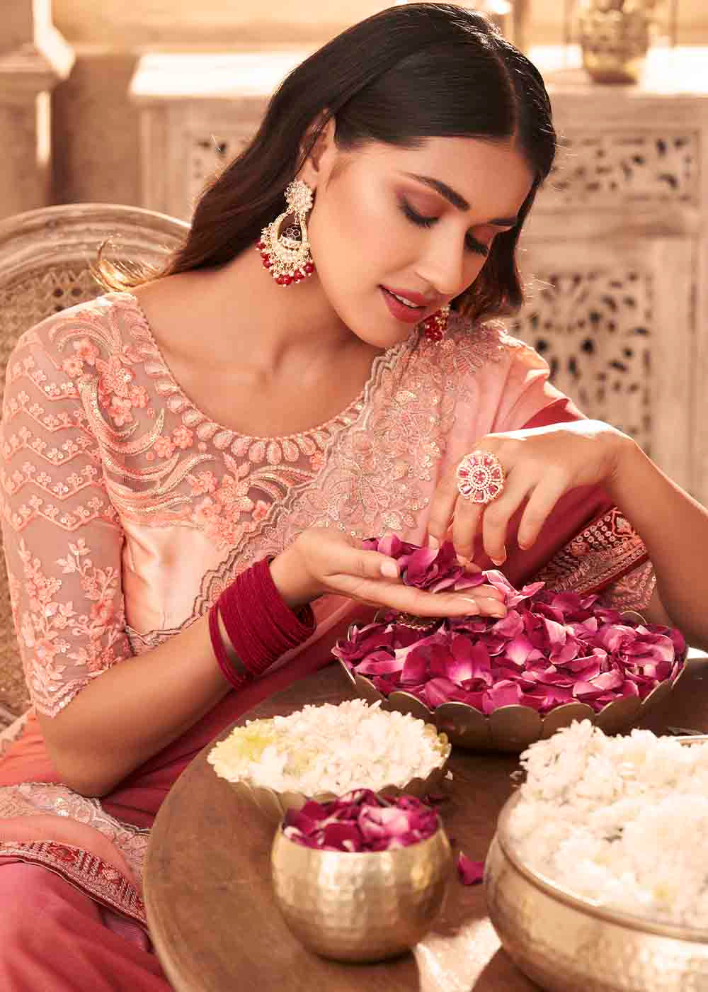 This festive season, add to the aura of love, happiness, and special blessings everywhere by making a bookmark-worthy look with this stunner! This Designer Embroidered Satin Silk Saree in shades of pink, delighted with sequence work is a lush charm to make sure your outfit game is on point. Let your aura speak with this glamorous ye t comfy piece.