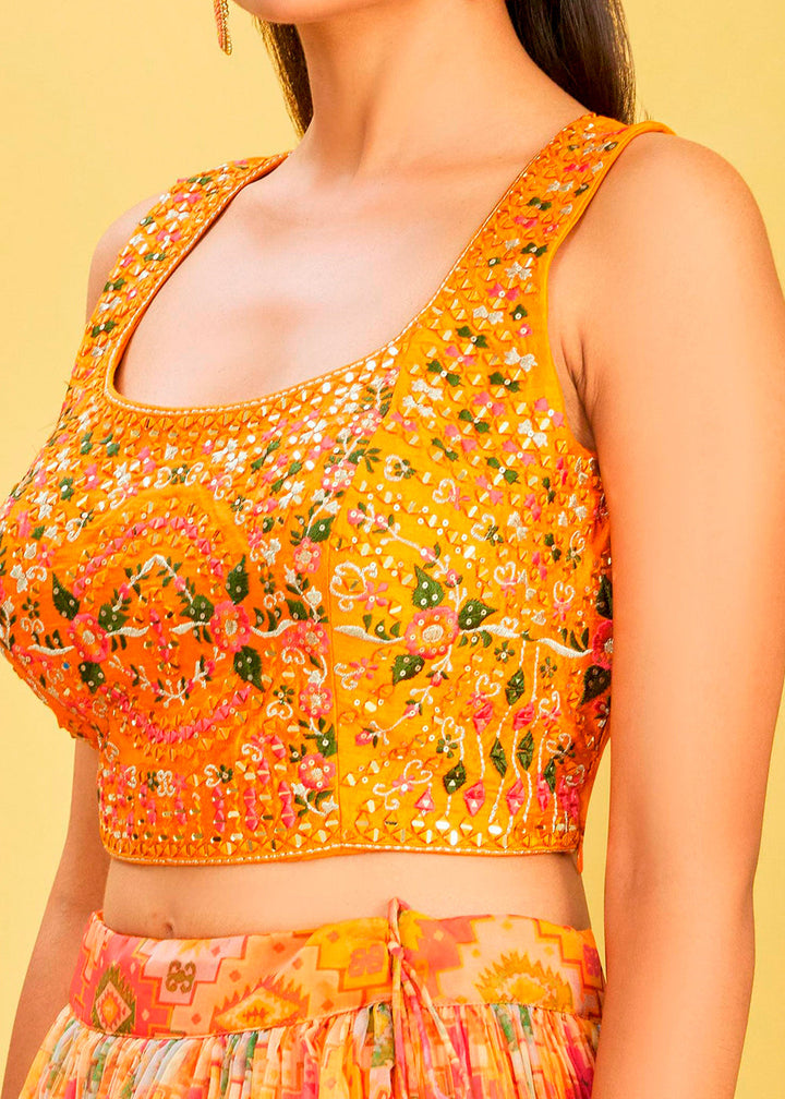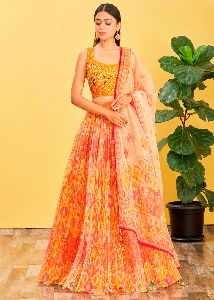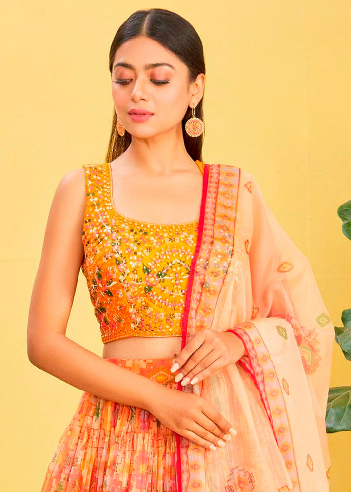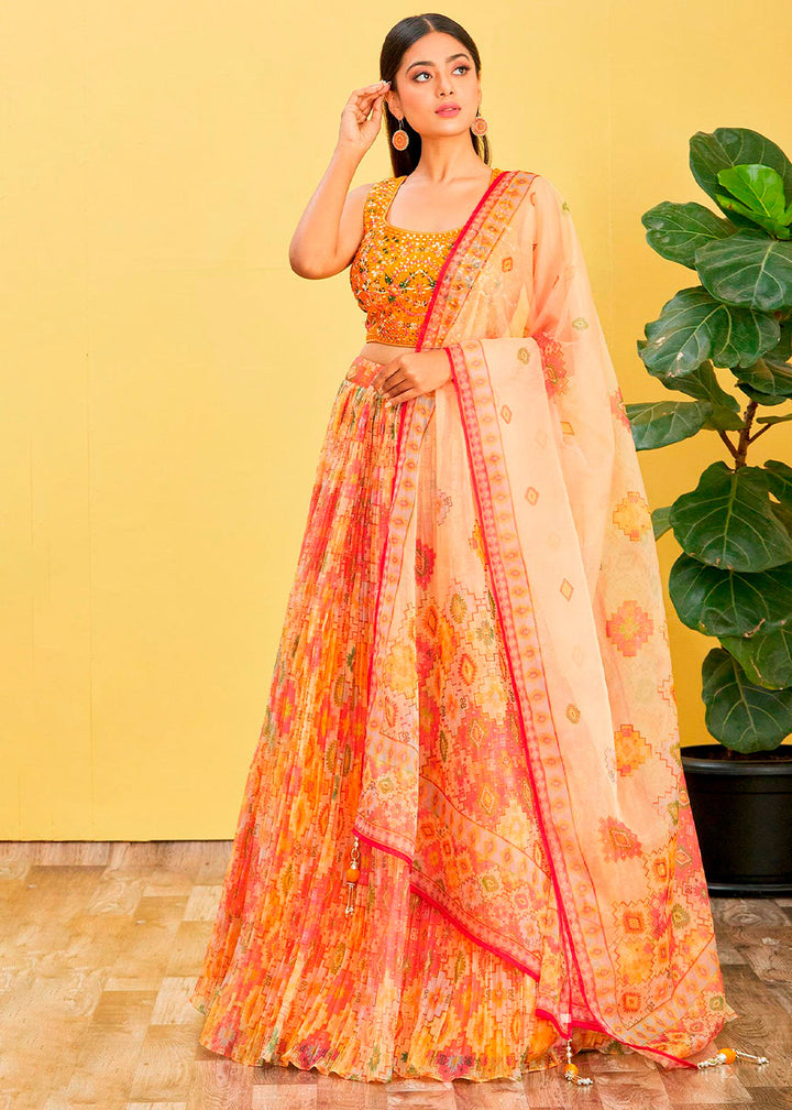 Shades Of Yellow Digital Printed Organza Lehenga with Thread,Zari & Sequins Work