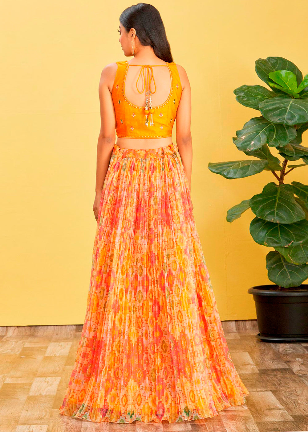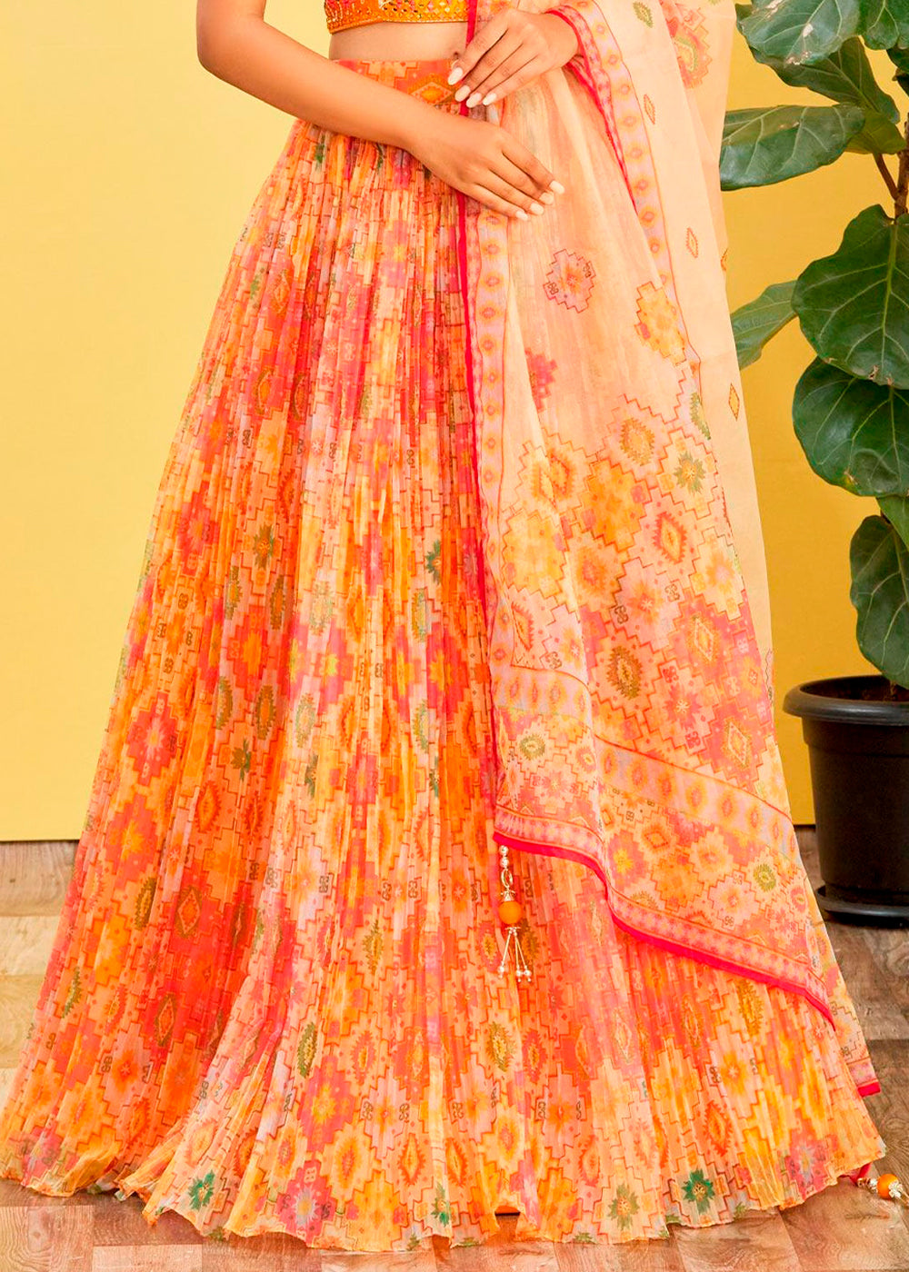 Tailored to perfection and basking in the radiance of Yellow hues, this beautiful Digital Printed Organza Lehenga is a true splendour. Interwoven with contemporary threads and delightful zari work, this drape is a perfect set to accentuate the gentler and softer side of you. Glittering sequins work enriches its allure even more.