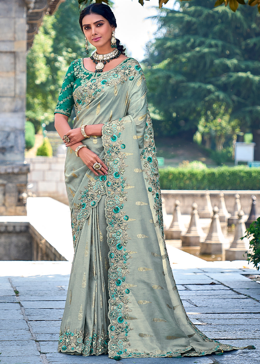 Silver Grey Tissue Silk Saree with Stone & Embroidery cut Work Border