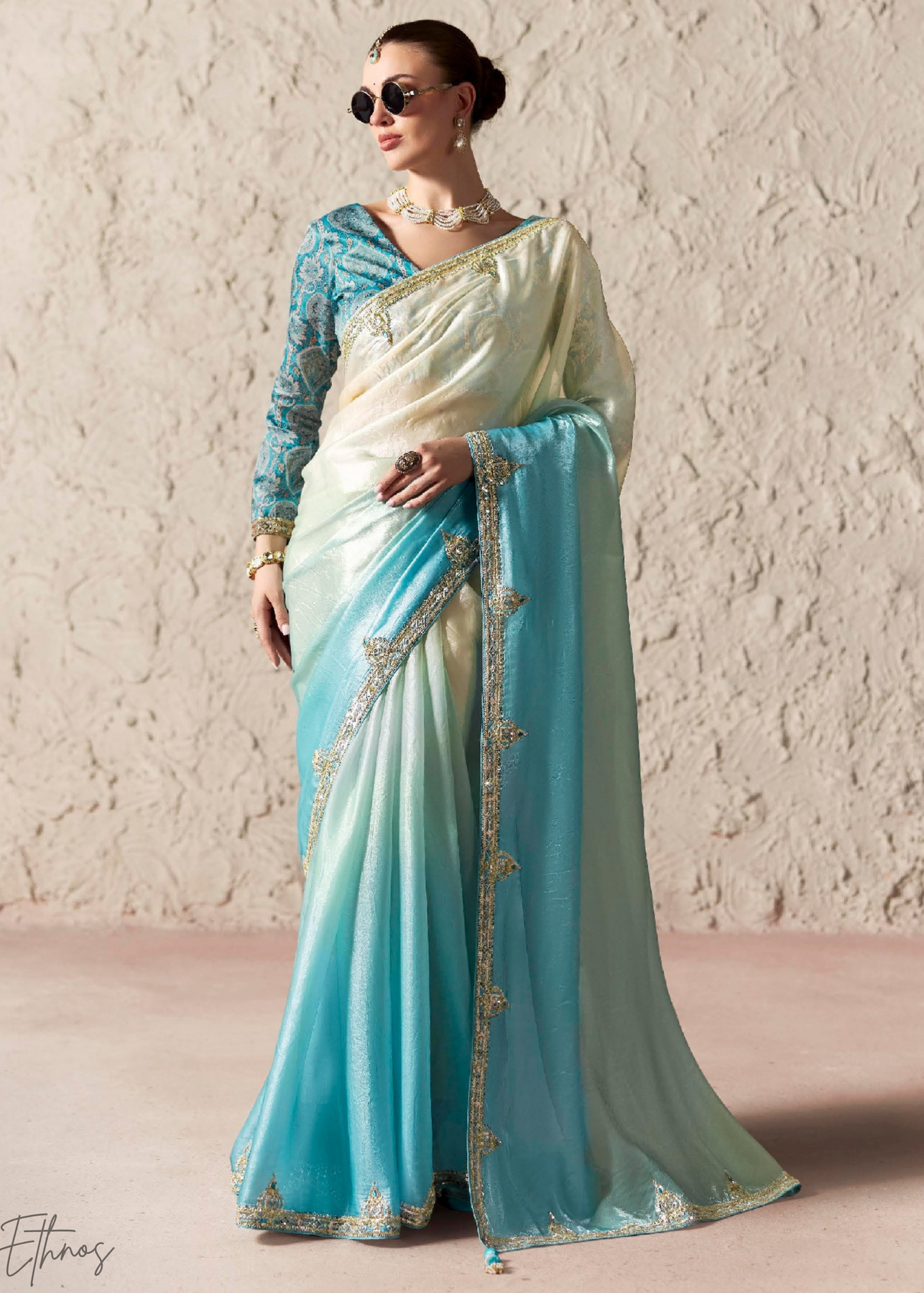 Saree: Glass tissue with thread & sequins embroidery.