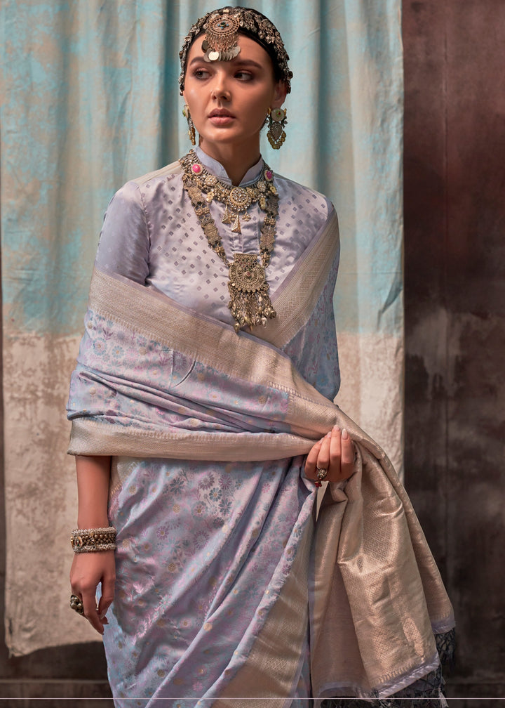 Embrace the elegance of our Sky Blue Pure Satin Handloom Weaving Silk Saree, a testament to exquisite craftsmanship and timeless design.