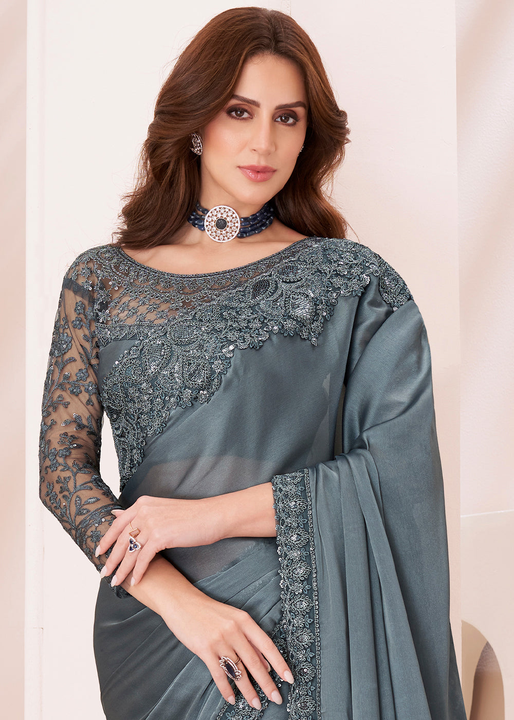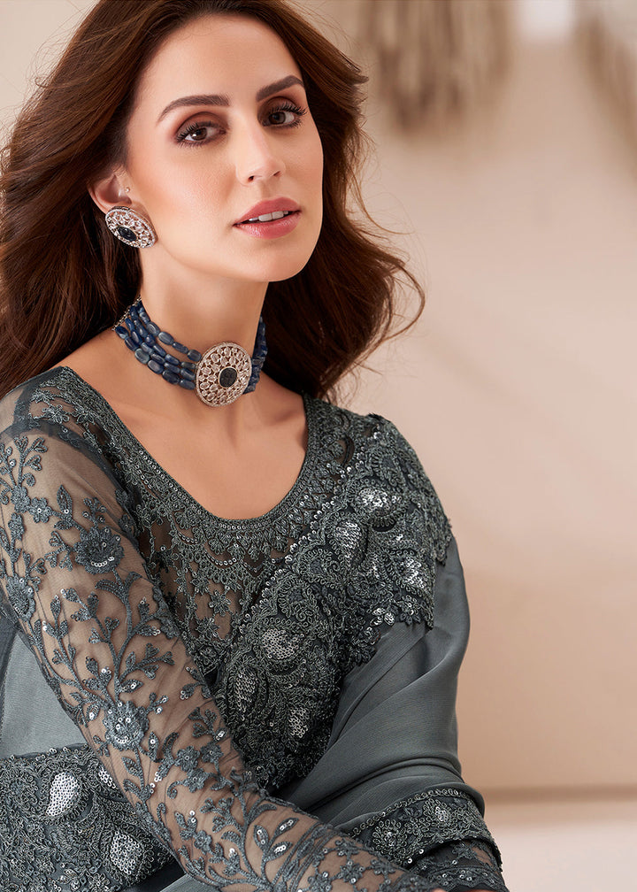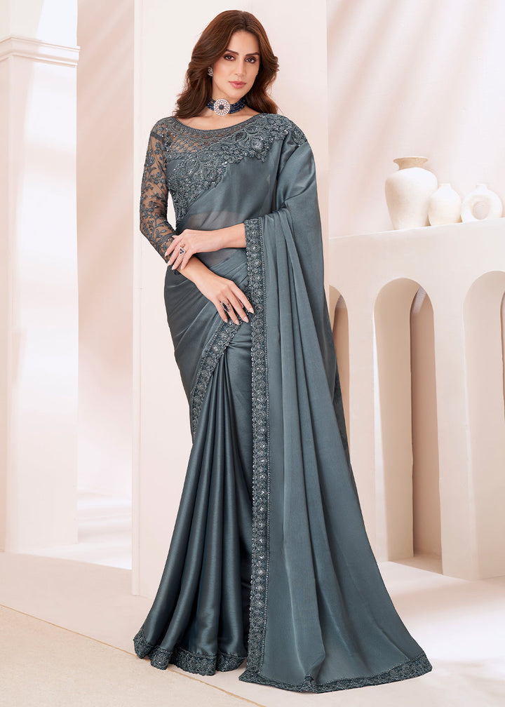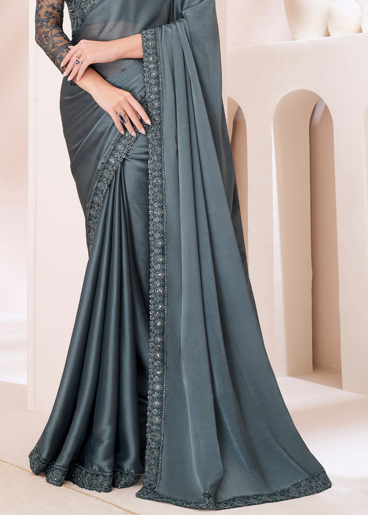 Slate Grey Designer Embroidered Satin Georgette Silk Saree
