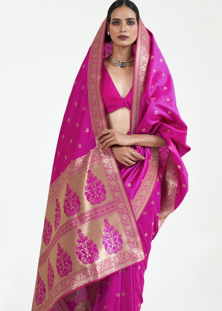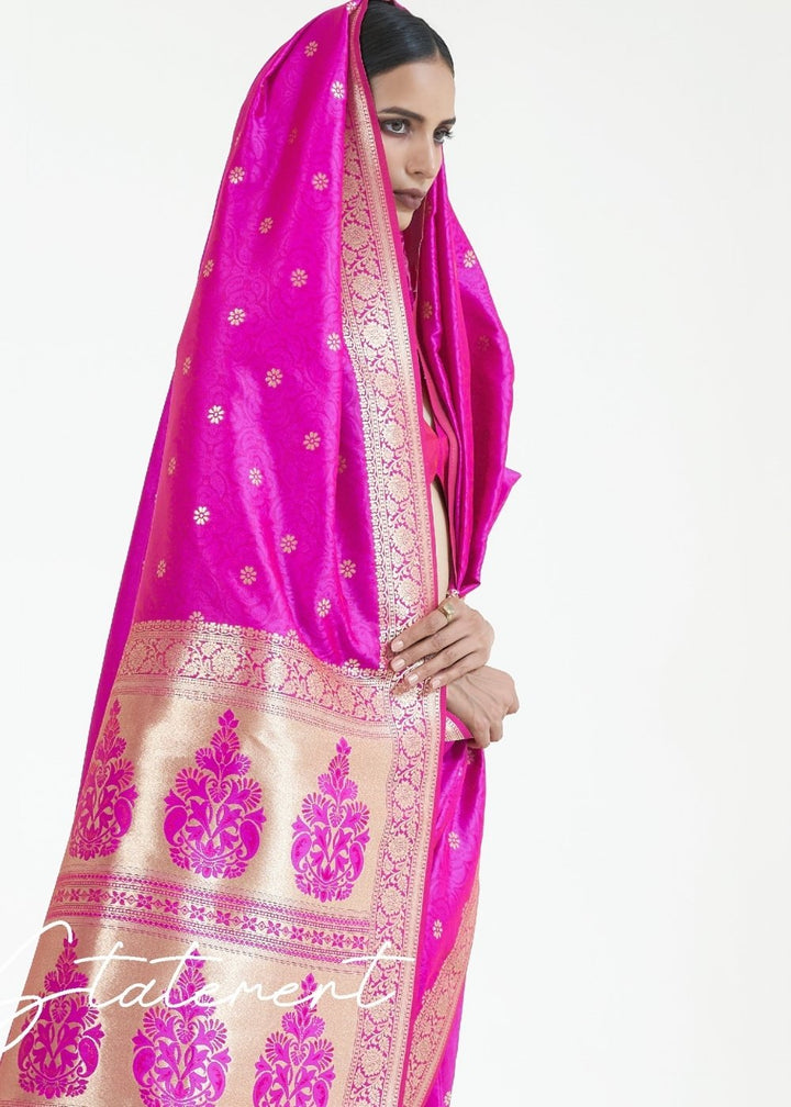 Wrapped in royal grace and charm, Kanjivaram silk sarees are timeless and are made by twisting and weaving premium silk yarns. Usually designed in a combo of two colors, these make the wearer stand out in sophistication and style. This glinting spicy pink drape comes beautified with an engaging border and Pallu to give you a lifetime of happiness.