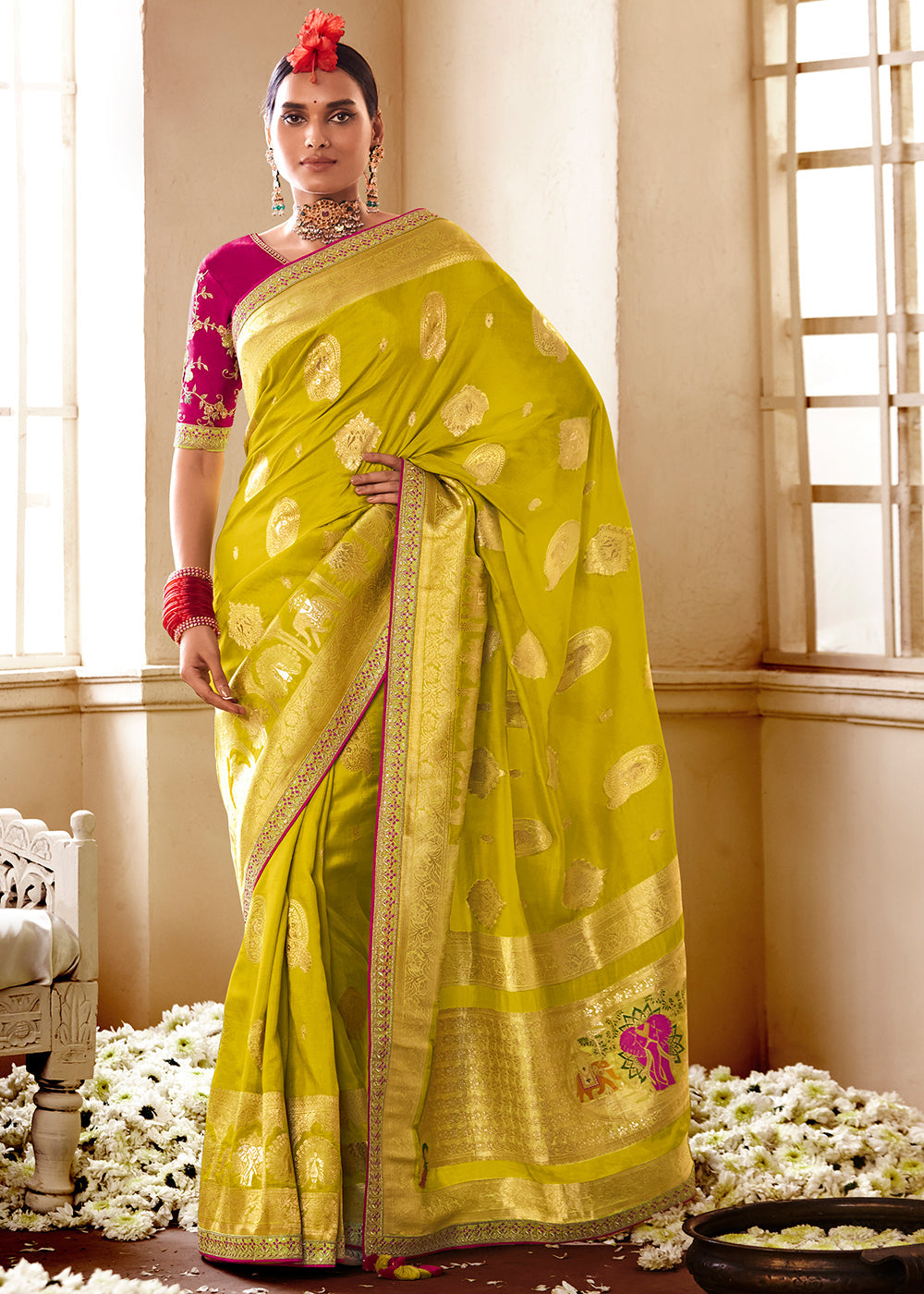Suphur Spring Green Woven Dola Silk Saree with Contrast Embroidered Border