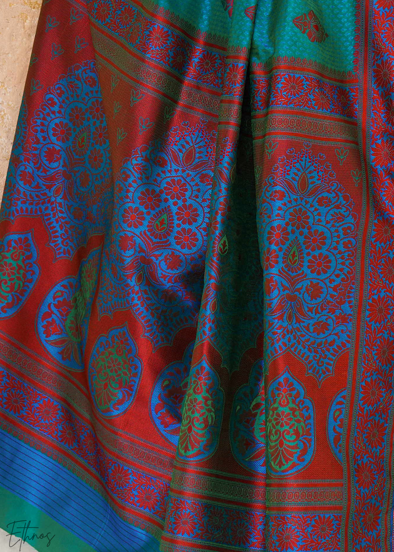 This exquisite saree has a captivating teal blue hue, woven from premium weaving silk boasting intricate jacquard weaving across the body and the elegant pallu. A striking contrasting border in red accents the rich blue shade, highlighting the traditional motifs. This traditional-style saree is an ideal choice for weddings, festials and special celebrations.