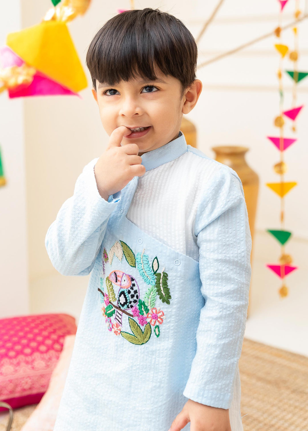 Brighten up any day with our Angrakha Toucan Kurta Set! This adorable kurta and matching pajama pants set is crafted from soft, breathable organic cotton, ensuring all-day comfort. The highlight of the kurta is the hand-embroidery that adds a burst of cheerful color and charm. Perfect for festive occasions, family gatherings, or casual outings, this set will keep your little one stylish and comfortable.