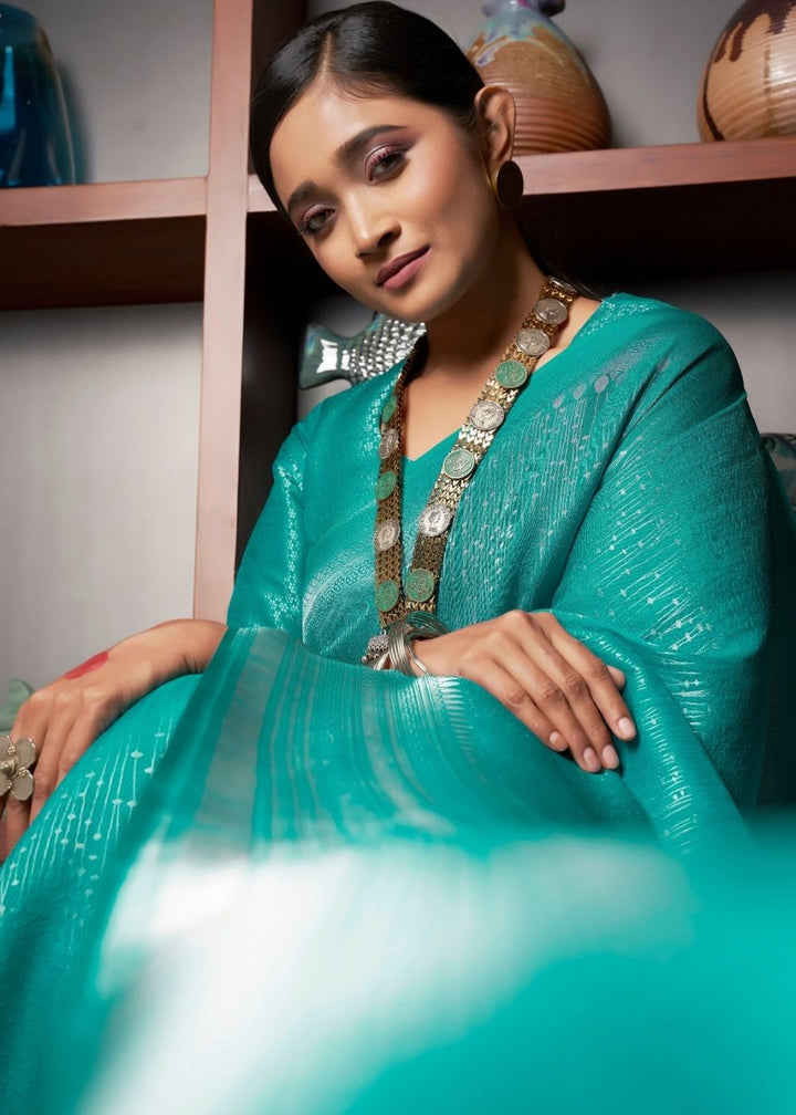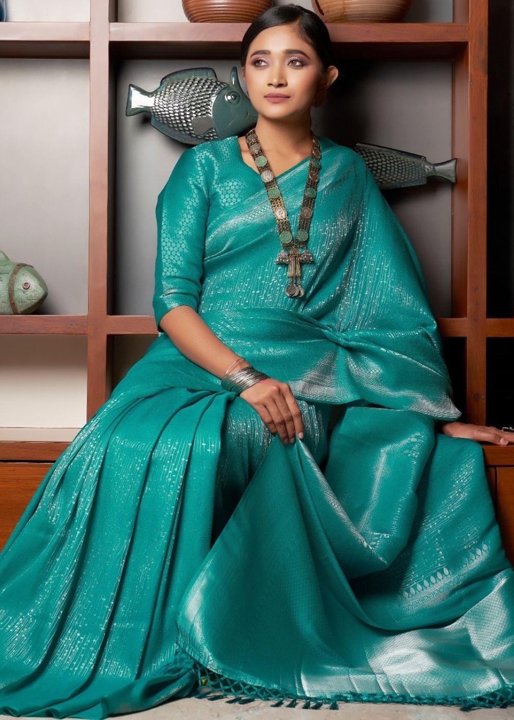Embrace your vibrant spirit with our assemblage of these tasteful Kanjivaram silk sarees wrapped in love and warmth. Enhanced by intricate silver zari work by our expert weavers of South India, this beauty comes in shades of turkish blue. A masterpiece in itself, this shimmering piece is designed meticulously to amplify your momentous occasions.