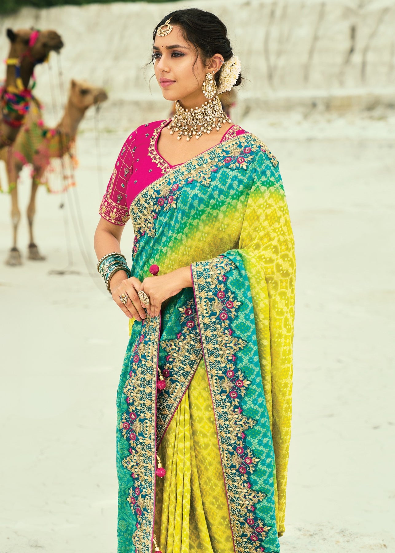 Turquoise Blue & Yellow Georgette Bandhej Saree With Moti & Cut-Dana Handwork Border