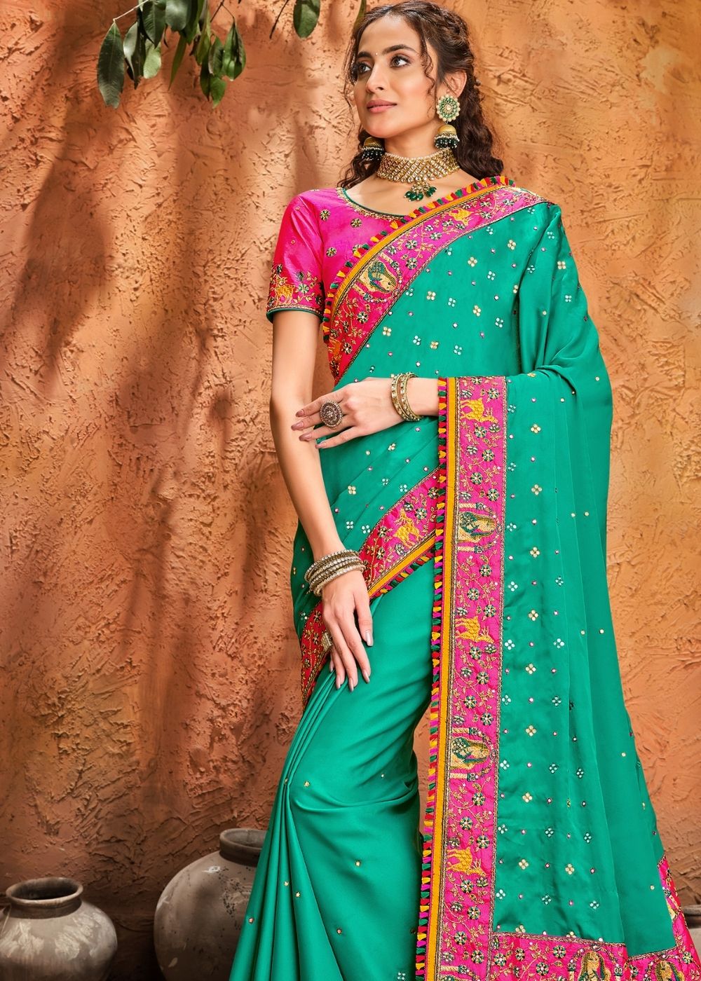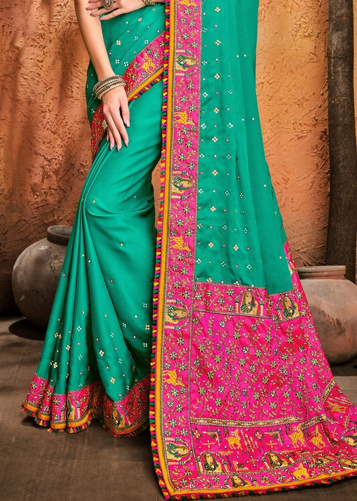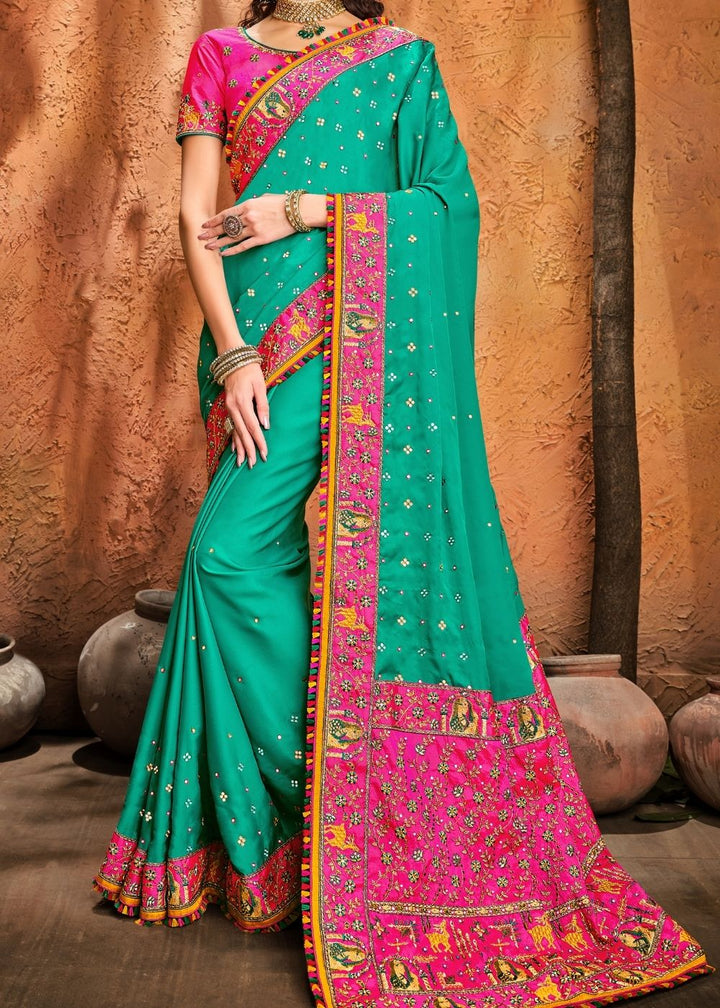 Turquoise Green Silk Saree with Mirror, Resham & Diamond work