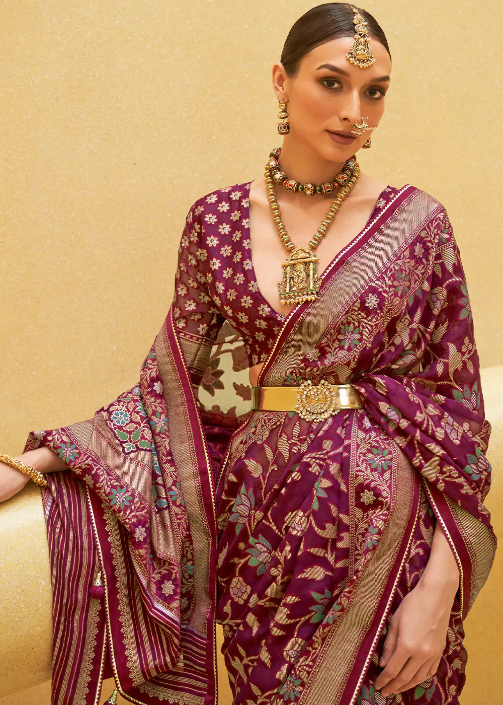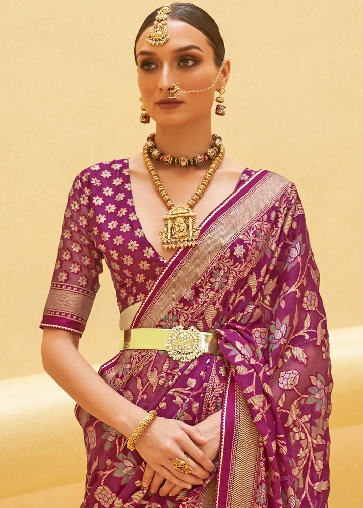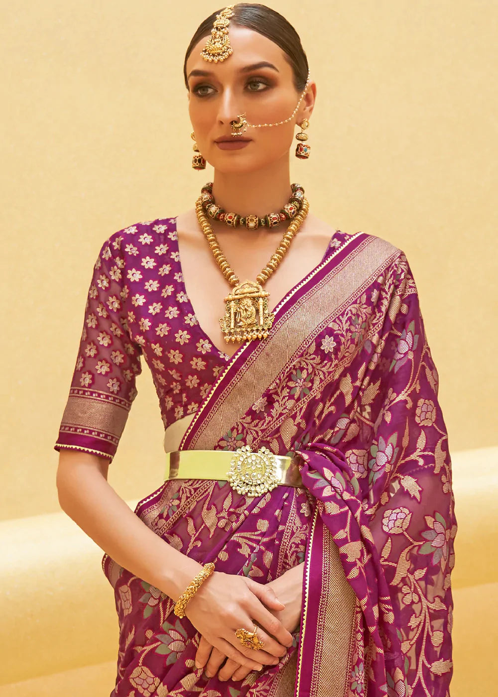 Tyrian Purple Zari Woven Brasso Organza Silk Saree