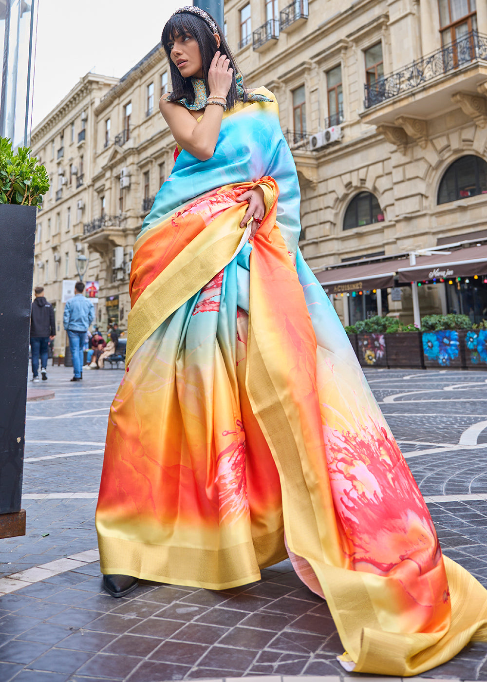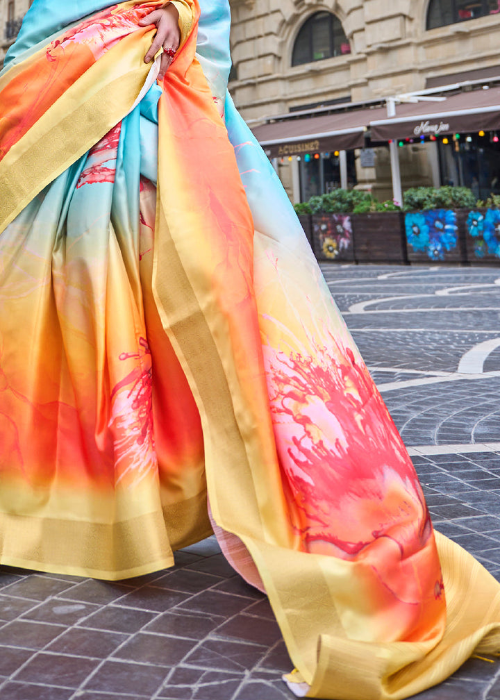 Yellow & Blue Digital Floral Printed Silk Saree
