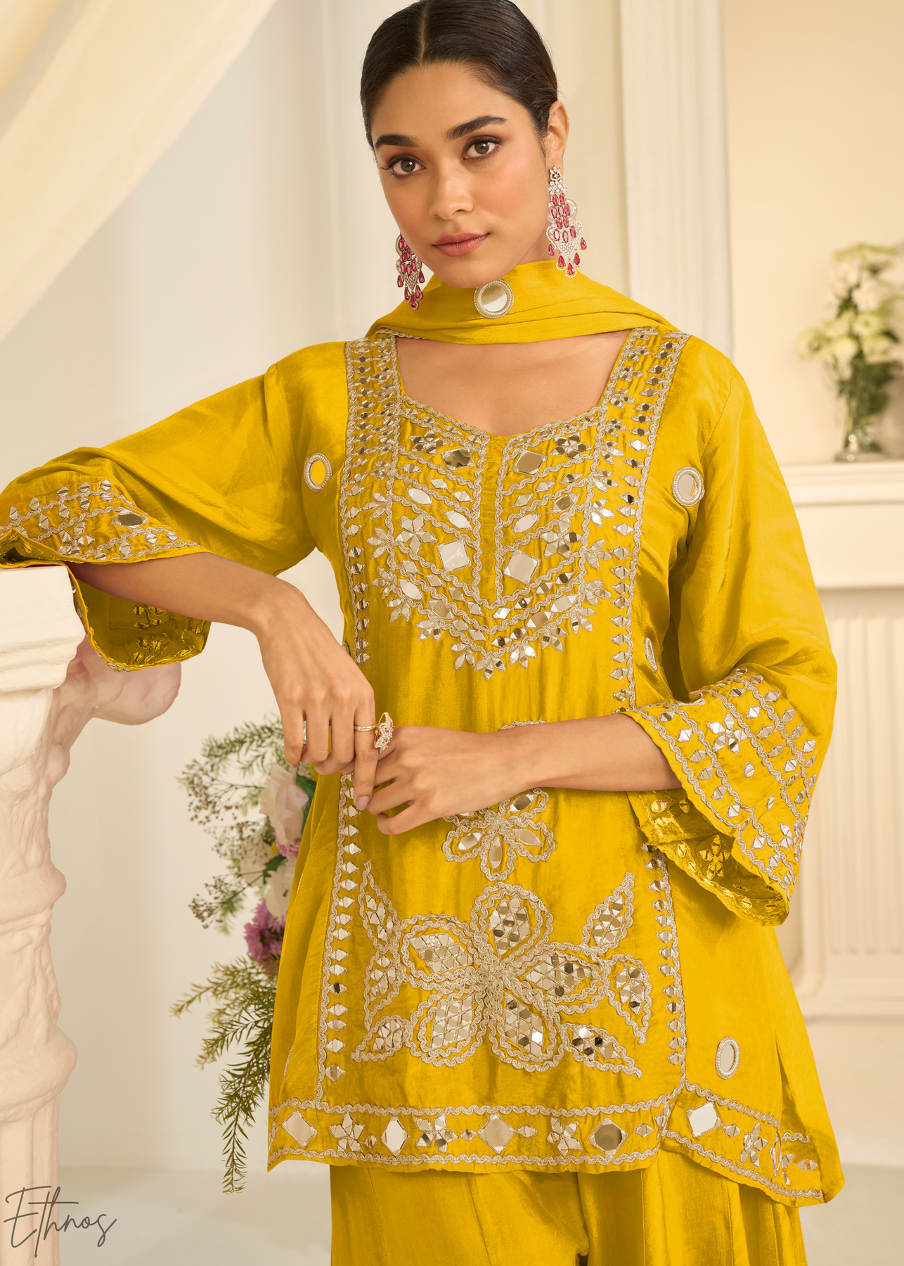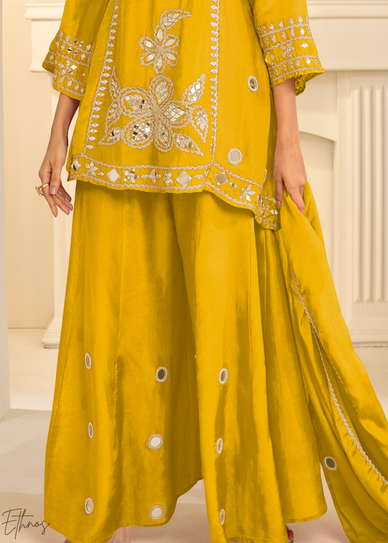 This vibrant mustard yellow palazzo set features a short-line kameez and voluminous flared pants, both heavily accented with intricate silver mirror-work and floral embroidery. The ensemble is designed with a classic U-neck and three-quarter sleeves, making it a radiant choice for haldi ceremonies, festive daytime events, or cultural celebrations.