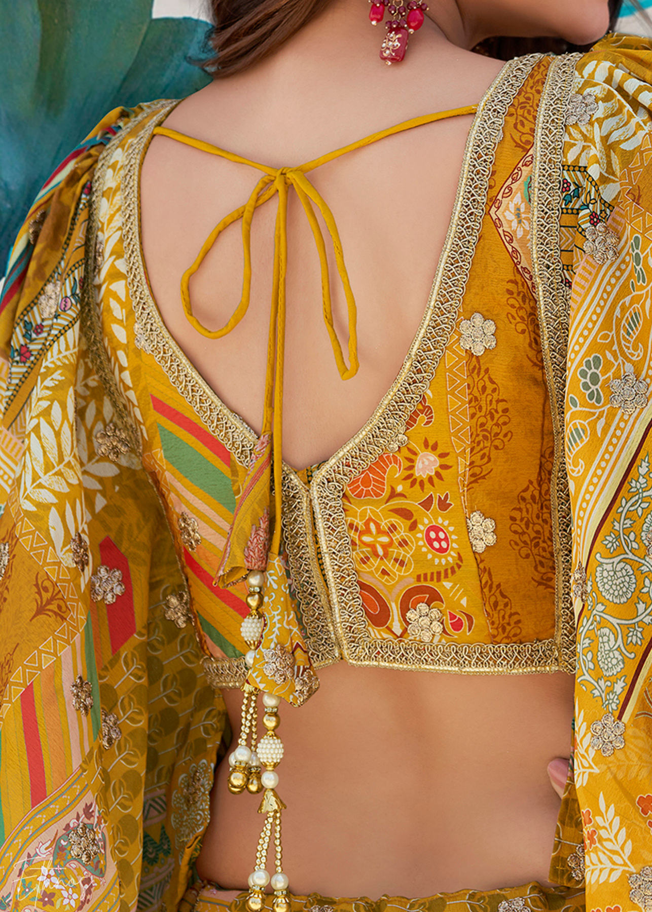 Blouse: Premium chinon silk embellished with zari dori embroidery.